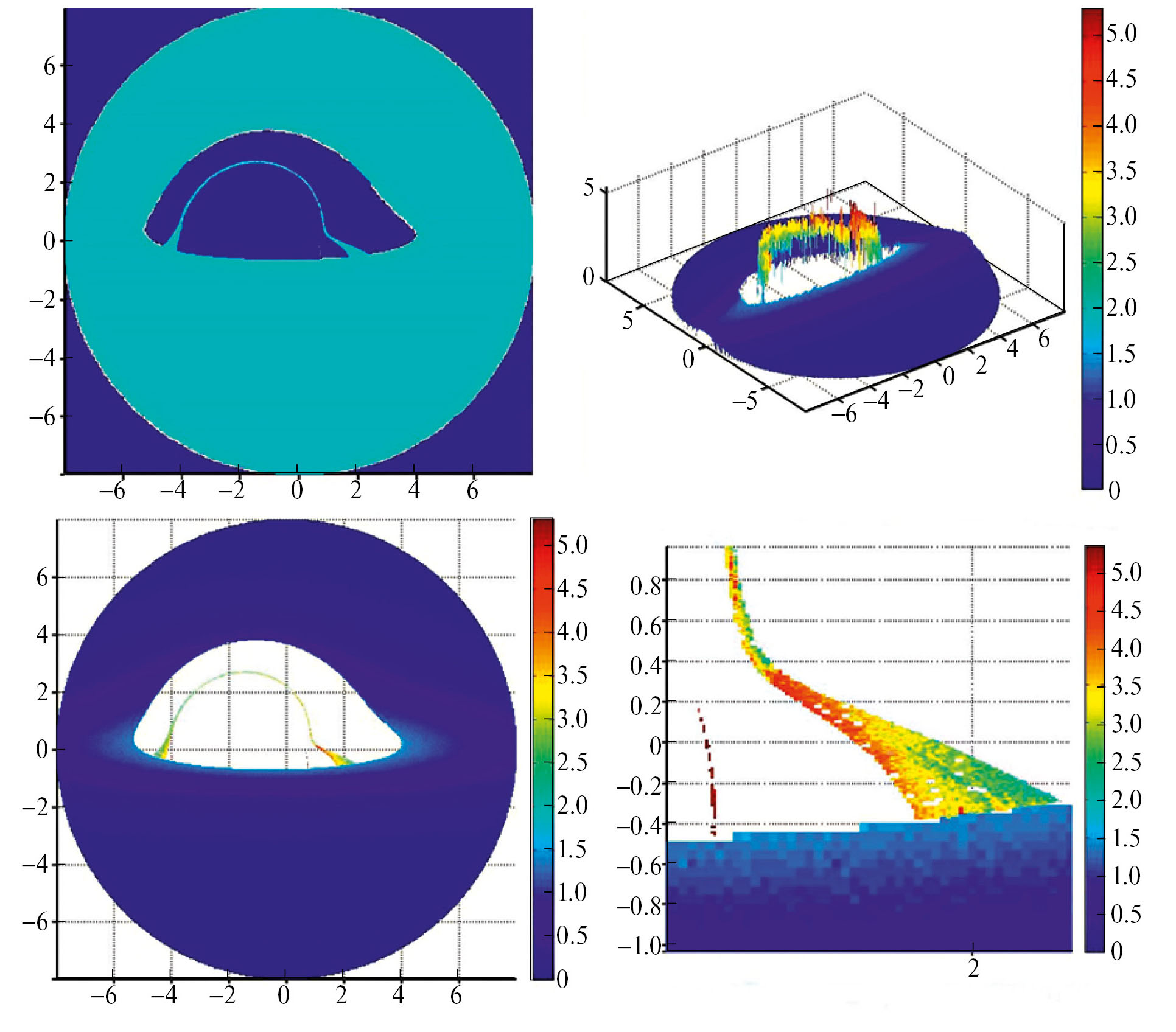 Каждый из рис. 2–5 состоит из четырех панелей. Сверху слева дано схематическое изображение тени: если из пикселя приходит хотя бы один фотон, пиксель окрашен в голубой цвет, если фотонов нет — в синий. Слева снизу показана относительная интенсивность излучения от разных участков тени ЧД в логарифмическом масштабе. Справа сверху изображение с нижней левой панели искусственно наклонено для лучшей визуализации, по вертикальной оси отложена относительная интенсивность излучения в логарифмическом масштабе. На нижней правой панели дано увеличенное в несколько раз изображение участка с фотонными кольцами. Рис. 2–5 различаются тем, под каким углом наблюдатель видит экран. В первом случае (рис. 2) угол между осью симметрии экрана и направлением на наблюдателя составляет 5°, на последующих трех рисунках он равен 30°, 60° и 80°.