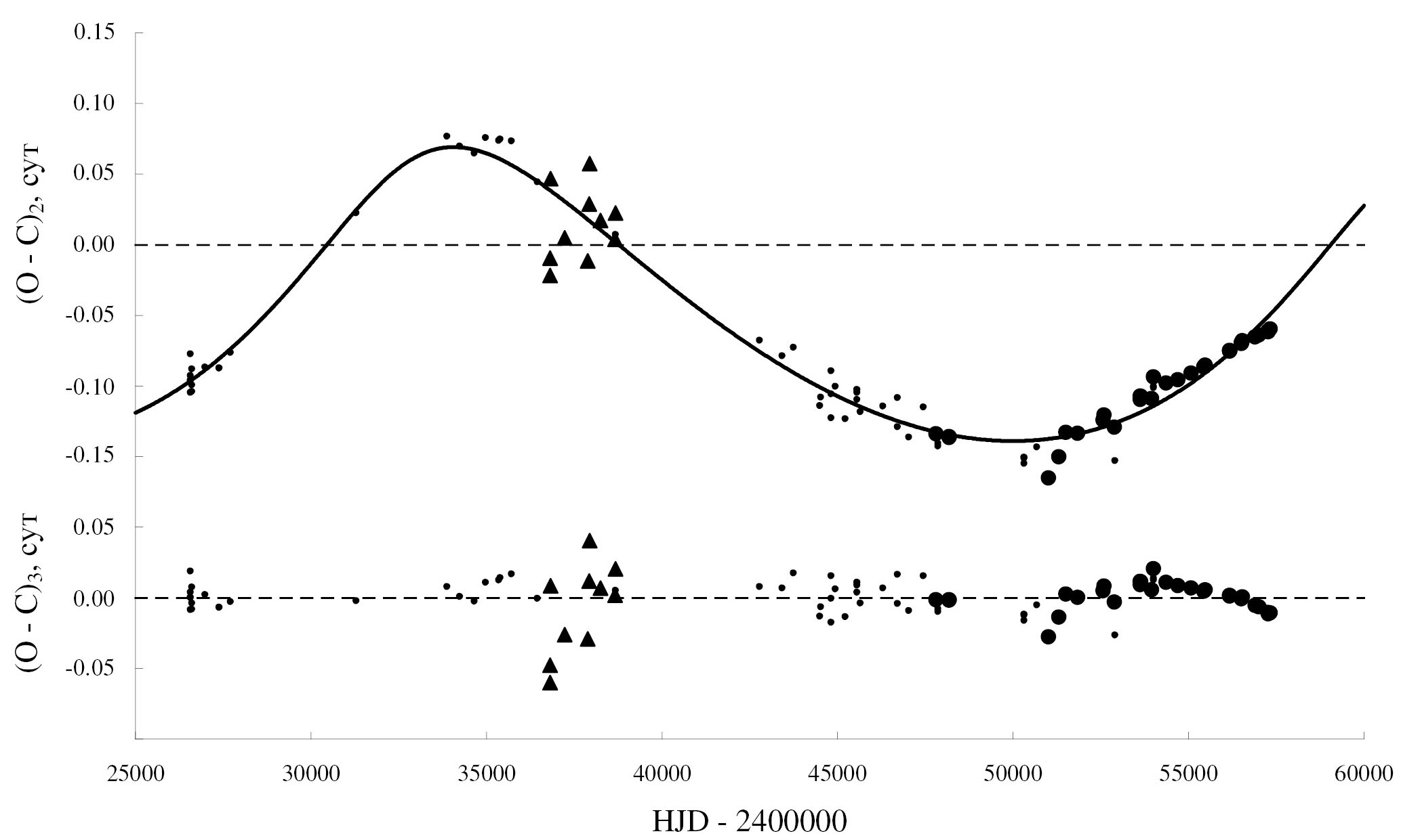 где T — эпоха наблюдения. Обозначения такие же, как на рис. 1. Из рисунка видно, что кроме вековых изменений периода, рассмотренных в работах [29] и [30], в системе наблюдаются циклические колебания периода, которые проявили себя благодаря самым последним наблюдениям моментов минимумов. В дальнейшем анализе мы не использовали сильно отклоняющуюся точку JD = 2452908.679, а остальные моменты минимумов были представлены квадратичной зависимостью, параметры которой были определены также методом наименьших квадратов: