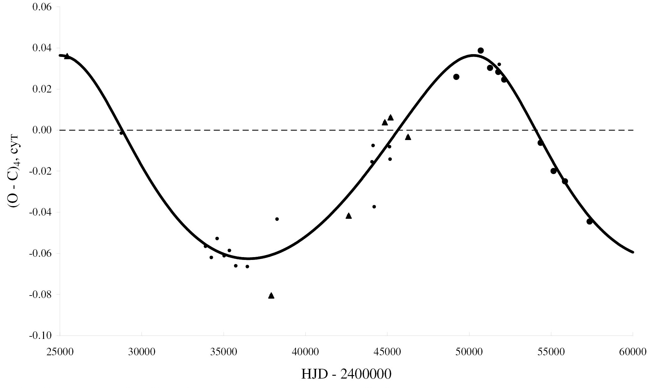 Параметры светового уравнения были определены тем же способом, что и в предыдущем разделе. Эти параметры приведены в первом столбце табл. 3. В таблице использованы те же обозначения, что в табл. 1. На рис. 4 приведены отклонения (O – C)₂ наблюдаемых (О) моментов минимумов BG Peg от вычисленных (C) с линейными элементами из представления (5). Сплошная линия на этом рисунке — теоретическая кривая для светового уравнения с параметрами из табл. 3. На этом рисунке видно, что кривая для светового уравнения неплохо описывает наблюдения. Однако отметим, что полученные параметры светового уравнения следует считать предварительными, для их уточнения нужны новые высокоточные наблюдения. Остатки после вычитания из наблюдаемых моментов минимумов теоретических, вычисленных по формуле (5), приведены в нижней части рис. 4.