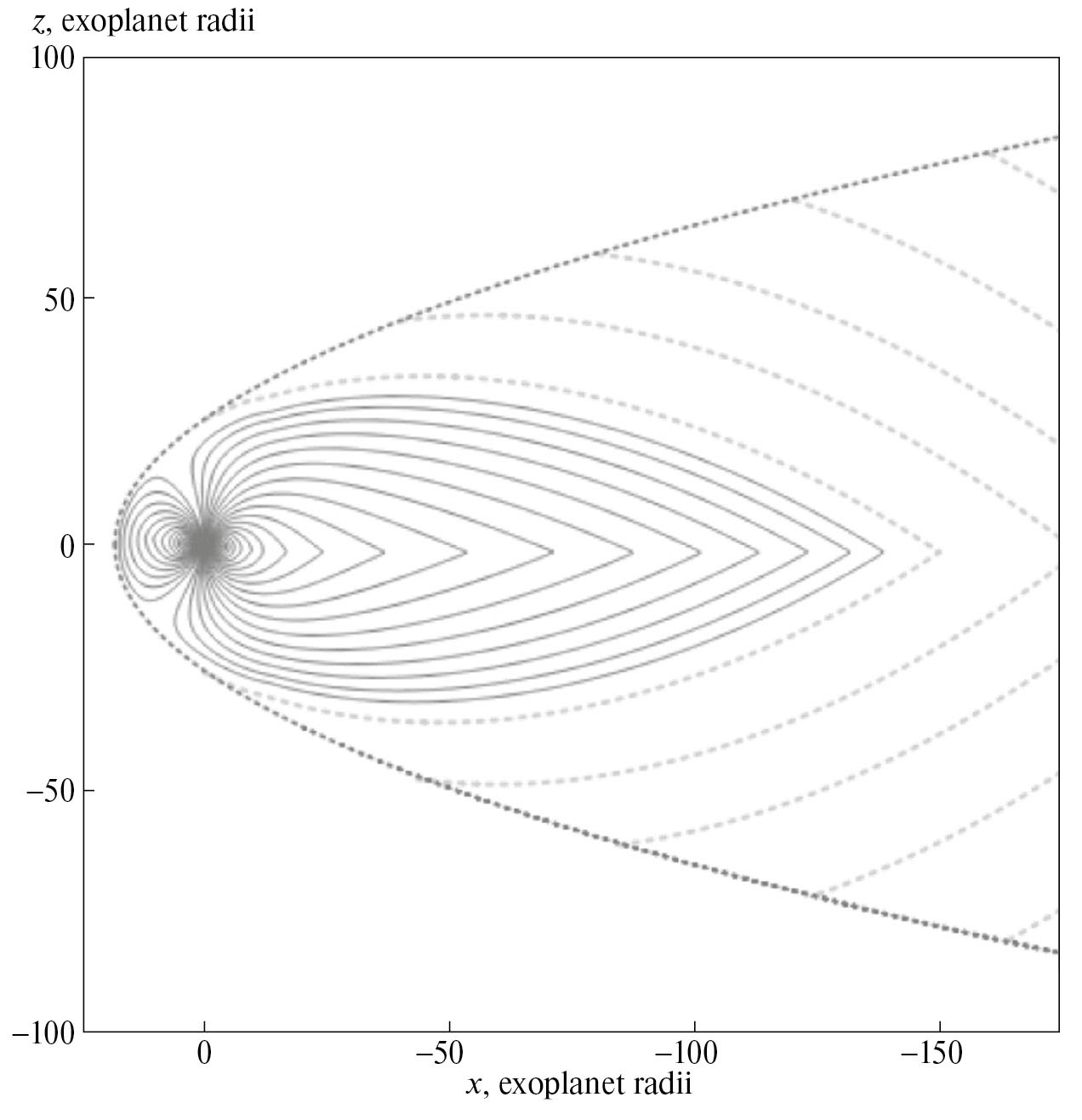 Рис. 1. Магнитосфера экзопланеты HAT-P-11b для равного нулю ММП в сечении полдень-полночь. Параметры модели приведены в тексте статьи, магнитный момент экзопланеты направлен на север. Сплошными линиями показаны магнитные силовые линии; пунктирной — магнитопауза. Кружком обозначена экзопланета. X и Z координаты отложены по горизонтальной и вертикальной осям.