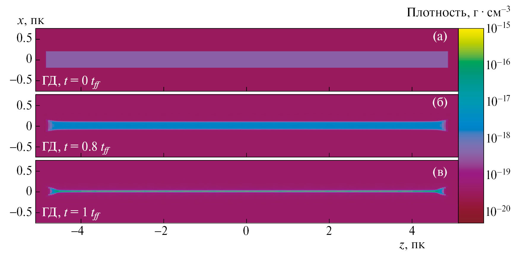 На рис. 2 приведены срезы плотностей в плоскости x - ɀ для расчета МГД-1 в моменты времени t = 0, 1tff , 1.28tff . В расчете МГД-1 к моменту времени t = 1tff волокно сжимается до радиуса r ≈ 0.1 пк и плотности n ≈ 1.77×10⁸ см⁻³. К этому моменту времени эффективный показатель адиабаты увеличивается от 1 до 2, сжатие вдоль r останавливается градиентом магнитного давления, и в дальнейшем облако осциллирует вдоль радиуса.