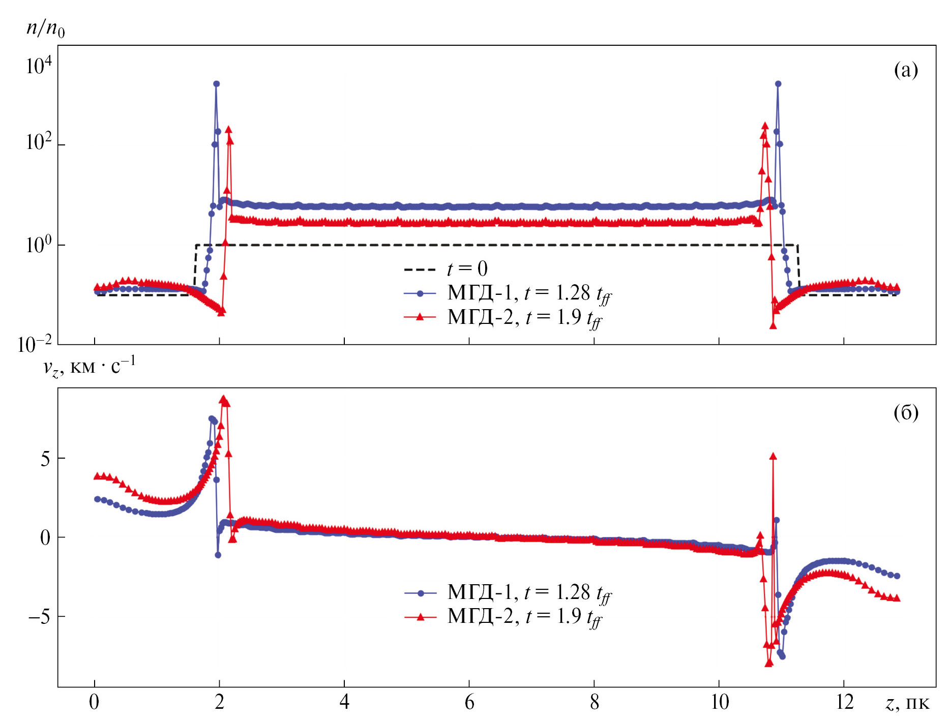 В расчете МГД-2 плотности и скорости ядер, расположенных в момент времени t = 1.9tff на координатах ɀL = 2.15 пк и ɀR = 10.75 пк, равны соответственно n = 2×10⁸ см⁻³и | vɀ | = 5 км/с, а соответствующее число Маха равно M = 8.3.