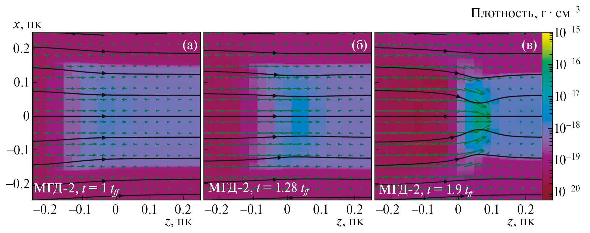 Рис. 6. Распределение плотности (цветовая заливка), поля скоростей (зеленые стрелки) и линий магнитного поля (голубые изолинии) в области формирования ядер в МГД-2 расчете в моменты времени t = 1tff (а), 1.28tff (б), 1.9tff (в).