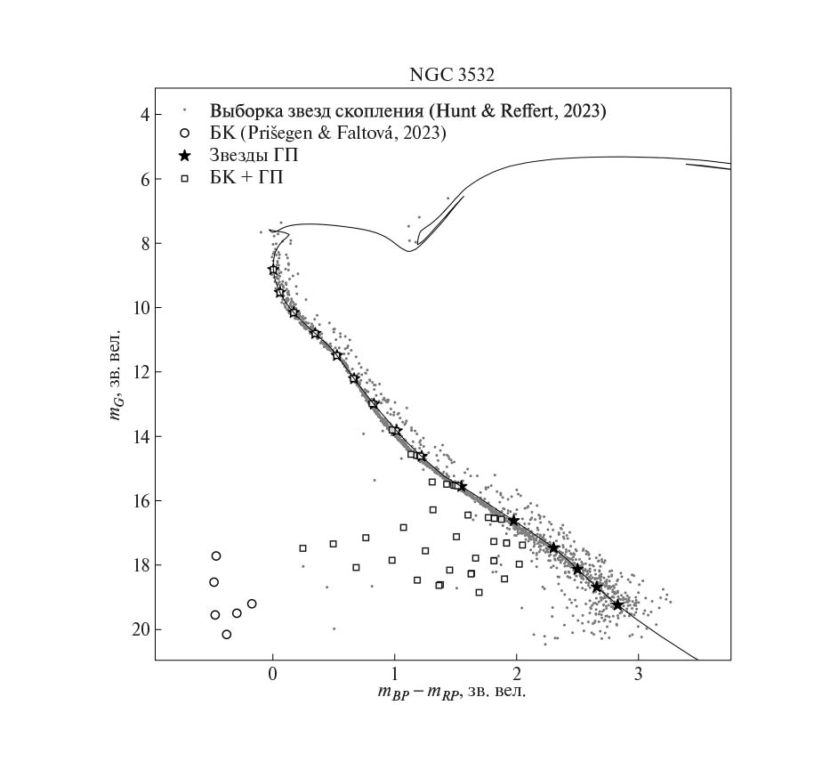где mБК — звездная величина БК, mГП — звездная величина звезды ГП, а mБК+ГП — звездная величина неразрешенной двойной системы. На рис. 2 показана диаграмма скопления NGC 3532 в фотометрической системе Gaia. Серыми точкам обозначены члены выборки с вероятностью принадлежности к скоплению >50% [32]. Черными звездочками указаны избранные звезды ГП, с которыми комбинировались ассоциированные со скоплением белые карлики, которые, в свою очередь, указаны открытыми кружками. Неразрешенные двойные системы с белыми карликами показаны квадратами. Из рис. 2 видно, что в случае сочетания БК с более горячей звездой ГП двойная система очень мало отличается от звезд главной последовательности.