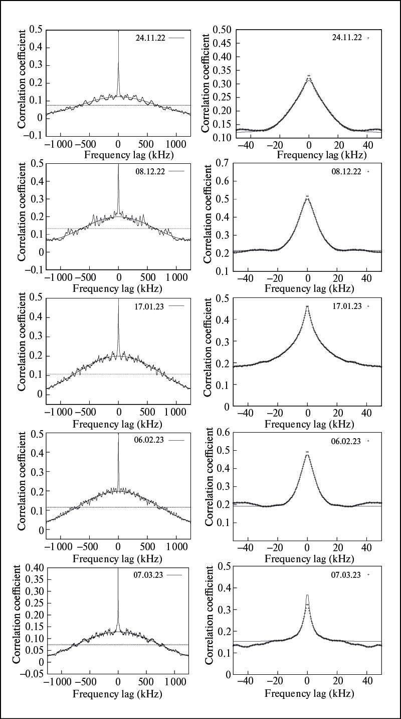 Параметры рассеяния для каждого сеанса наблюдений приведены в табл. 1. Содержание таблицы описано в ее заголовке. Каждая величина содержит ошибку параметра, определенную формальной процедурой аппроксимации данных методом наименьших квадратов. Наличие пробелов в некоторых ячейках таблицы связано с плохой аппроксимацией, вызванной нестандартной формой сечений 2DACF для некоторых наблюдательных сеансов. Примеры частотных сечений представлены на рис. 3 в двух частотных масштабах: с широкой шкалой ±1.25 МГц (левые панели) и с узкой шкалой ±50 кГц (правые панели). Шумовая составляющая при нулевом частотном сдвиге убрана. На правых рисунках видны две частотные структуры: широкая частотная структура, вызванная фарадеевским вращением плоскости поляризации в полосе приемника, и узкая частотная структура, вызванная межзвездными мерцаниями. Значения периода фарадеевского вращения приведены в 6-м столбце табл. 1; эти величины были определены путем аппроксимации данных синусоидальной функцией на частотном интервале за пределами 50-килогерцового диапазона, в котором доминирует дифракционный эффект. Амплитуда ACF соответствует коэффициенту A в уравнении (5).