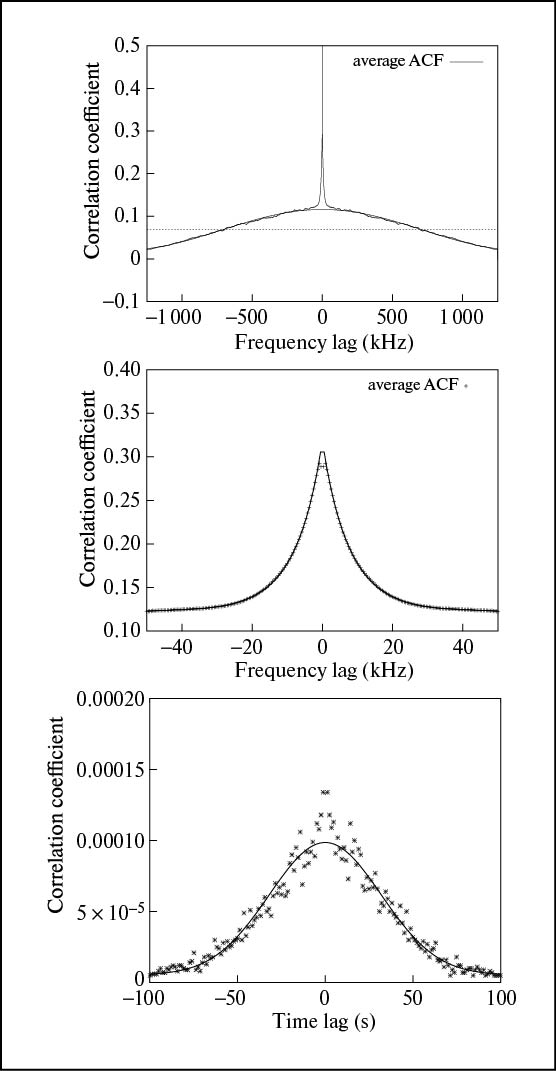 Рис. 4. Функции, усредненные за весь период наблюдений. Вверху — средняя ACF в широком диапазоне сдвигов по частоте, в центре — ее центральная часть (устранено значение при нулевом сдвиге по частоте). Внизу — временно́е сечение средней 2DACF со следующими параметрами: Pf = 5.7 ± 0.1 МГц; fdif = 5.2 ± 0.1 кГц; α = 0.95 ± 0.01; tdif = 45.0±1.7 с.