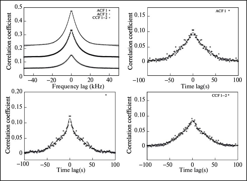 Рис. 5. Сравнение временны́х и частотных сечений ACF и CCF для двух компонентов среднего профиля. Параметры, полученные при аппроксимации соответствующих функций, приведены в табл. 2.