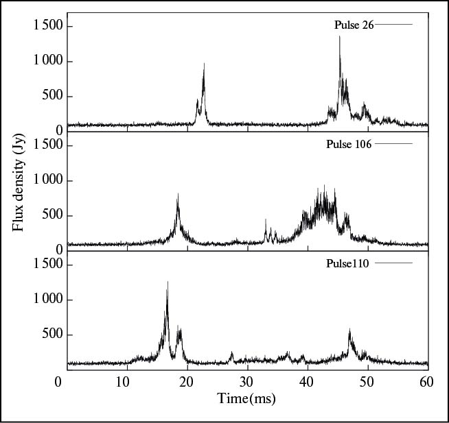 Вольжан и Кордс [14] наблюдали периодическую структуру в динамическом спектре PSR B1237+25, полученном на телескопе Аресибо (AR), на частоте 430 МГц. Они интерпретировали эту структуру как интерференционную картину, образованную двумя лучами с разными траекториями прохождения через межзвездную среду. Было показано изменение периодической структуры в динамических спектрах в зависимости от долготы импульса, и дана оценка типичного поперечного расстояния между областями излучения ~103 км для экрана, расположенного на половине расстояния между пульсаром и Землей. Такое большое разнесение областей излучения соответствует высоте излучающей области, близкой к радиусу светового цилиндра. Аналогичные результаты были получены для пульсара B1133+16 Гуптой с соавторами [15] с использованием радиотелескопа обсерватории Ути на частоте 327 МГц. Они также наблюдали множественные изображения во время рефракционного события и обнаружили немонотонное изменение фазы интерференции вдоль профиля импульса. Было определено разделение областей излучения в передней и хвостовой части профиля в 3 × 107 м, что соответствует нижнему пределу высоты излучающей области ≥ 2.6 × 103 км.