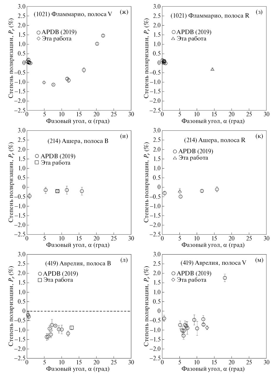 На рис. 1(а)–(е) показаны результаты наших измерений степени поляризации астероидов в полосах B, V и R вместе с данными разных авторов, взятых из каталога APDB [16].