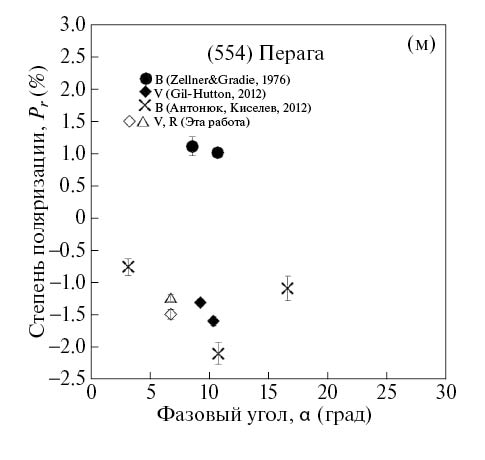 Для уточнения вида отрицательной ветви ФЗП Антонюк и Киселев [27] провели в 2006 г. измерения поляризации (554) Перага в диапазоне фазовых углов 3–16°, в том числе и на близком фазовом угле 10.7°, на котором проведены наблюдения Зельнера и Градье. Вопреки данным Зельнера и Градье, была установлена отрицательная степень поляризации астероида, Pr = –2.10 ± 0.17%. В ошибочность результатов наблюдений Зельнера и Градье трудно поверить, зная огромный опыт этих наблюдателей и то, что они сами обратили внимание на необычные данные для (554) Перага. Поэтому Антонюк и Киселев выдвинули предположение, что различия в поляризации реальны и вызваны различиями в свойствах областей поверхности астероида, которые были доступны для наблюдений Зельнеру и Градье в 1975 г. и Антонюку и Киселеву в 2006 г. Эклиптические координаты астероида в 1975 г. и 2006 г. составили (λ = 181.6°, β = –2.7°) и (α = 21.1°, β = 2.9°) соответственно. Если ось вращения астероида близка к плоскости эклиптики, то разница в эклиптических долготах 160° дает возможность наблюдать две разные части поверхности астероида (северную и южную приполярные области) в эти два периода наблюдений. Позже Гил-Хаттон и др. [28, 29] измерили поляризацию (554) Пераги в полосе V на фазовых углах 9.2° и 10.3°. Она оказалась отрицательной: Pr = –1.31% и –1.6% соответственно. Эклиптические координаты астероида составили λ = 286.5°, β = –0.5° и λ = 264.1°, β = –1.5°. Нельзя исключить также, что уникальные свойства поляризации (554) Пераги, полученные Зельнером и Градье в 1975 г., были вызваны вре́менной сублимационно-пылевой активностью, обнаруженной для ряда астероидов ([3] и ссылки там). Поэтому наблюдаемые особенности поляризации Пераги стали основанием включения этого астероида в программу поляриметрического мониторинга.