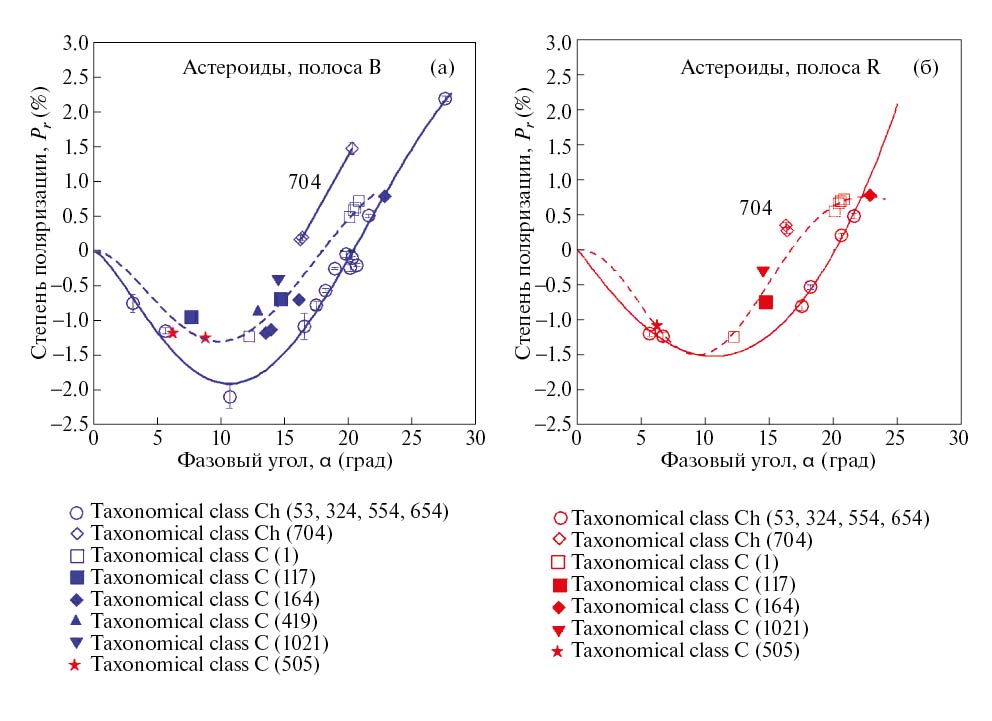 Из рис. 2 видно, что степень поляризации астероидов (53) Калипсо, (324) Бамберга, (554) Перага и (654) Зелинда, относящихся к таксономическому классу Ch (согласно [20], см. также табл. 1), можно аппроксимировать едиными фазовыми кривыми поляризации в синей и красной полосах. Вместе с тем кривая поляризации астероида (704) Интерамнии того же спектрального класса Ch заметно отличается от этих кривых. Степень поляризации астероидов (1) Цереры, (117) Ломии, (164) Евы, (419) Аврелии и (1021) Фламмарио, относящихся к С-типу, систематически выше по сравнению с ФЗП астероидов Ch-типа и имеет большее рассеяние данных. Это, а также пример с астероидом (704) Интерамнией, указывает на необходимость привлекать к таксономии астероидов, кроме данных по спектрофотометрии и альбедо, данные по поляризации.