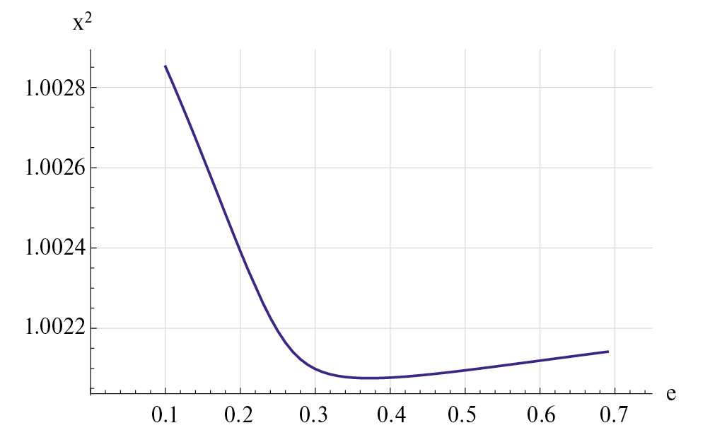 Рис. 2. Зависимость от e невязки χ2, минимизированной по всем остальным параметрам, в линейном законе потемнения к краю. Использовалась синтетическая кривая блеска с центральными значениями e = 0.1, ω = 120, точность наблюдений 10–5.