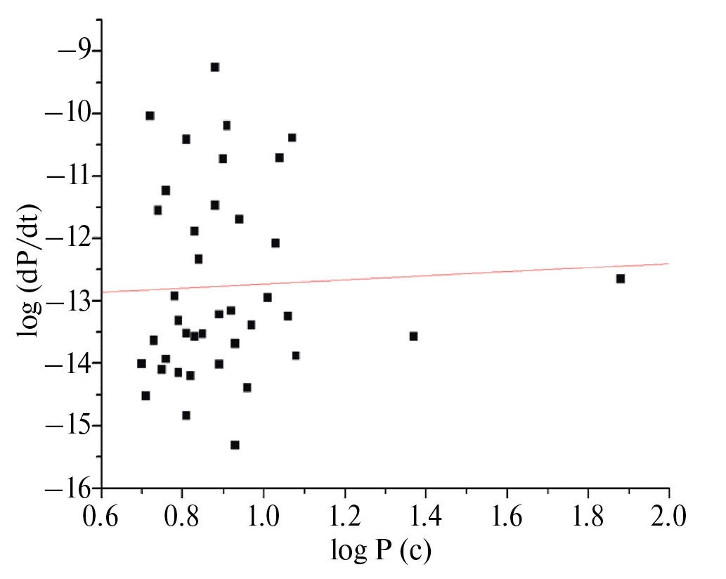 На рис. 1 приведена диаграмма , построенная по данным каталога ATNF. Этот рисунок показывает, что для исследуемой выборки нет явной зависимости dP / dt от P. Формальное вписывание прямой на приведенной диаграмме дает