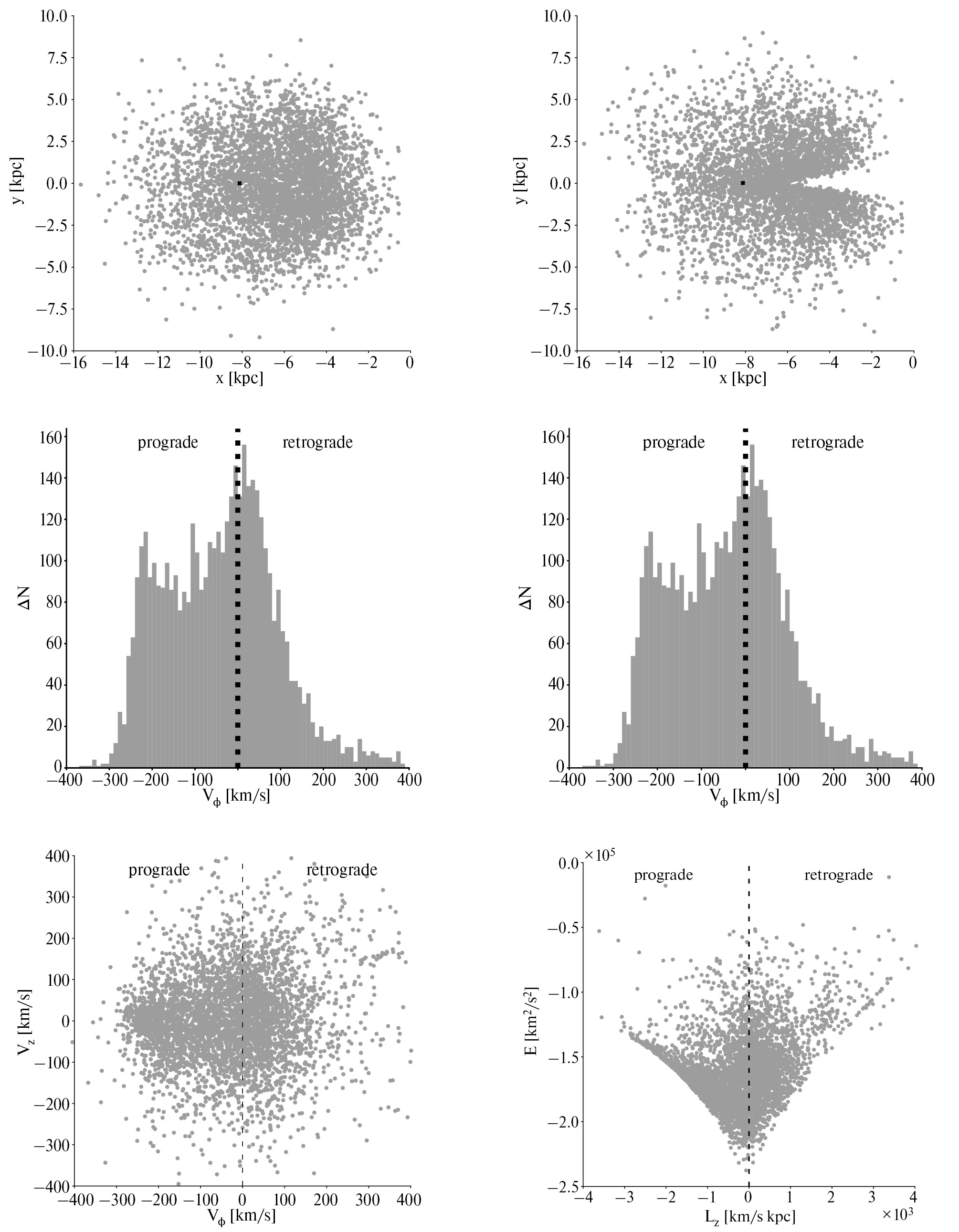 Суммарный угловой момент гало Галактики связан с историей аккреции объектов, включающих не только карликовые галактики, такие как Стрелец, но и с аккрецией более крупных объектов, таких, как недавно открытая аккрецированная галактика Гайя-Энцеладус [5], с аккрецией которой связана значительная доля ретроградно вращающихся звезд. Если аккреция отдельных галактик происходит в случайных направлениях, суммарный вращательный момент звезд гало Lz должен быть близок к нулю [6]. Отметим также, что проградное вращение части звезд гало может быть обусловлено их взаимодействием с вращающимся баром [7].