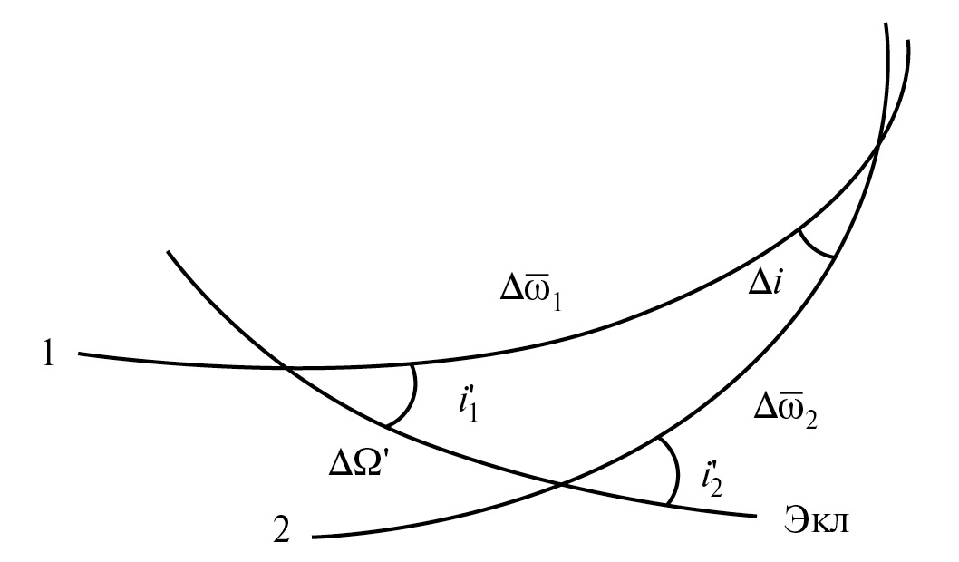 поэтому из соотношений для сферического треугольника на рис. 1 следует равенство разностей углов наклона в обоих используемых в задаче системах отсчета