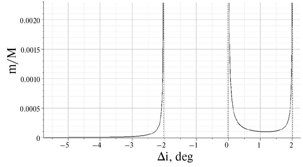 Тогда график зависимости отношения массы кольца Хаумеа m к массе самой Хаумеа M от разности между углами наклона границ кольца Хаумеа Δi будет иметь две области, см. рис. 2, где физически приемлемой является правая область этого графика.