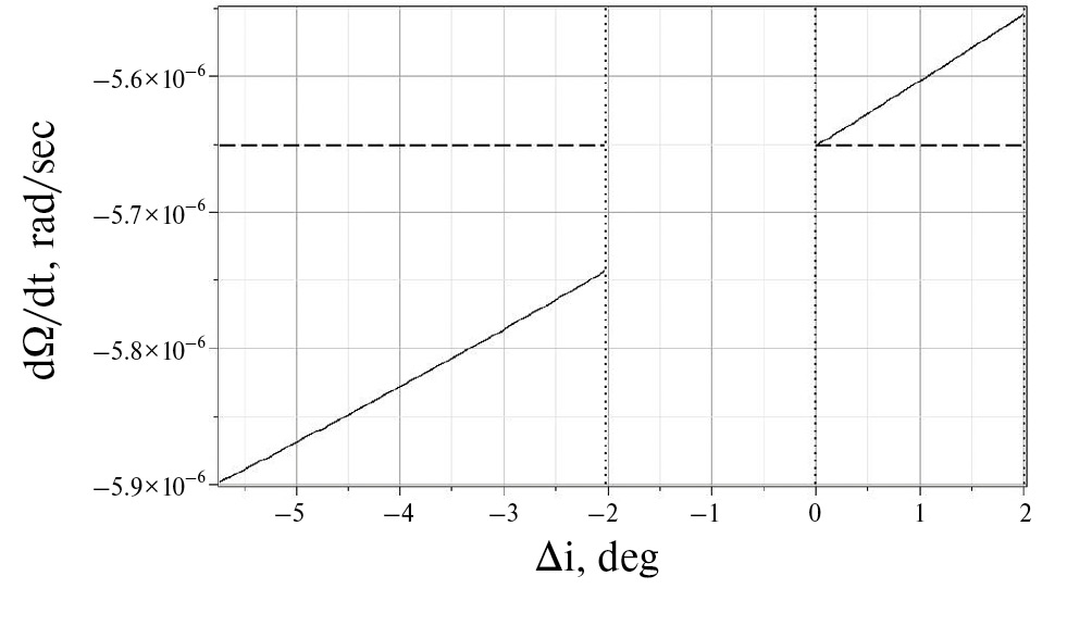 4. Fig. 3. Precession of the line of nodes of the Haumea ring in the equatorial plane of the central body depending on the difference in the angles of inclination of the boundaries of this ring ∆i. The dashed line indicates the value of the angular velocity without taking into account the self-gravity of the Haumea ring (see formula (45)).