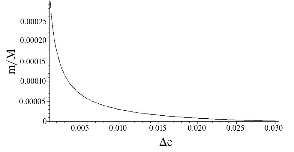 Рис. 4. Отношение массы кольца Хаумеа m к массе самой Хаумеа M в зависимости от разности эксцентриситетов границ этого кольца e, при максимальном среднем арифметическом эксцентриситете этих двух границ e = emax.