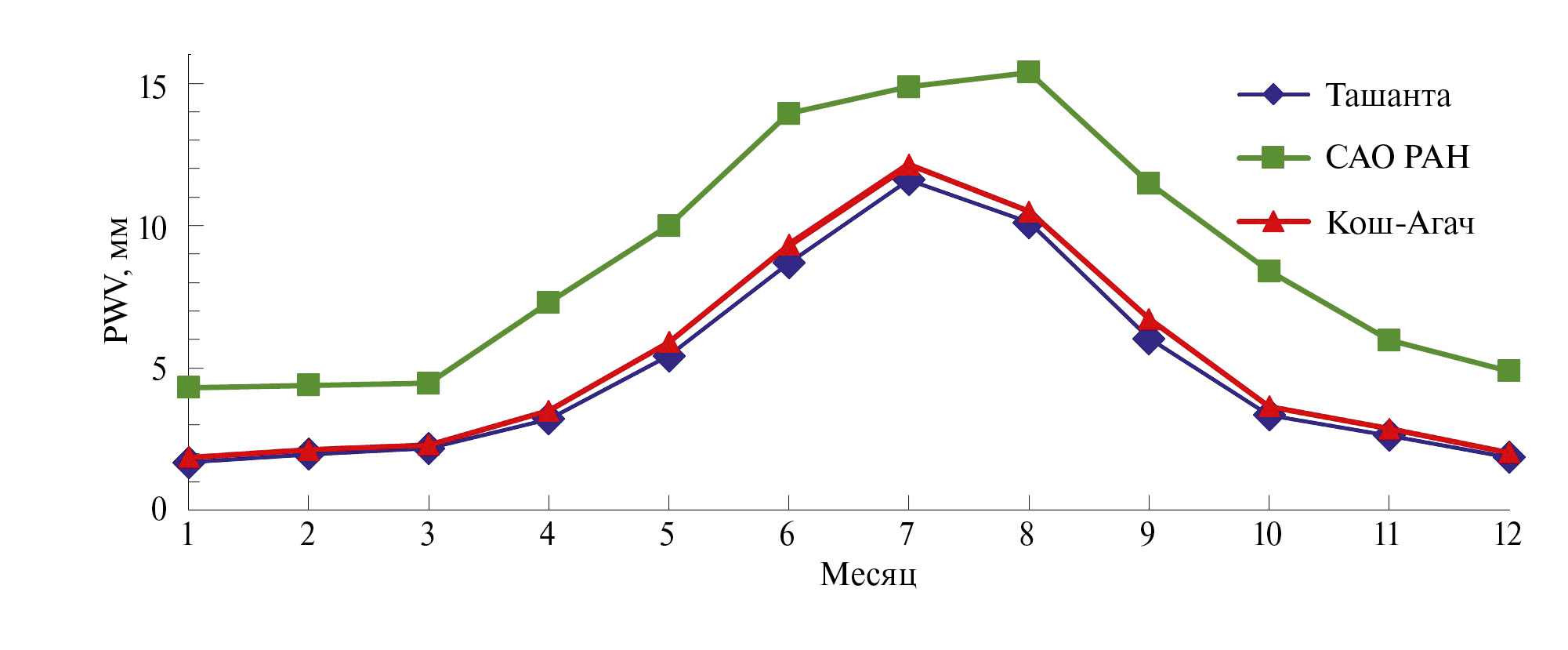 Эта зависимость с меньшими значениями для лета и большими для зимы типична для атмосферы средних широт. При этом в существующих астрономических обсерваториях РФ на этих высотах медианные значения для летнего периода превышают 10 мм [12, 15]. Отметим низкие значения (около 2 мм) для зимних месяцев в пунктах Горного Алтая. Из сравнения на рис. 1 хорошо видно преимущество пунктов Горного Алтая по сравнению с САО РАН: количество осажденной воды меньше в два раза в летний период, 4.3 мм и 2.1 мм, соответственно, а в зимние месяцы — на 40%. Сравнение данных для пунктов Ташанта и Кош-Агач показывает незначительные различия, при этом можно отметить меньшее значение около 10% над пунктом Ташанта в зимний период.