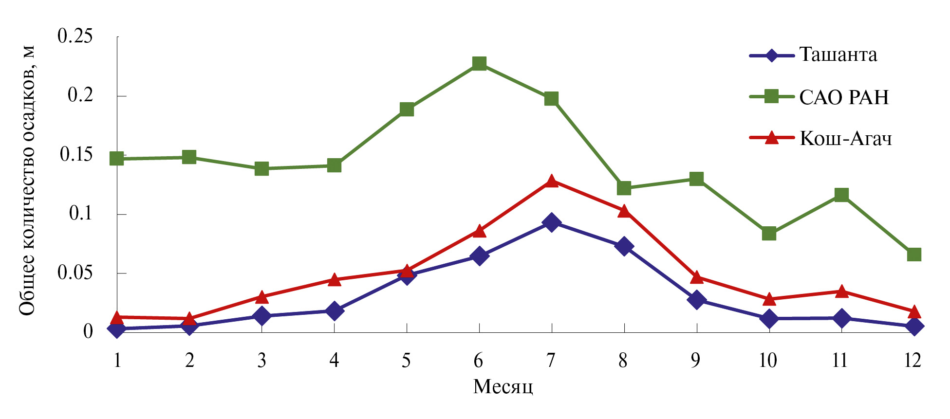 Вода, содержащаяся в атмосфере в виде осадков, отражает или преломляет и ослабляет излучение. Поэтому важен поиск самого сухого места для установки инструментов миллиметрового и субмиллиметрового диапазона. На рис. 2 приведены медианные значения за пять лет для каждого месяца общего количества осадков (total precipitation) для трех указанных выше пунктов по данным реанализа ERA5. Аналогично с количеством осаждаемого водяного пара преимущества пунктов Горного Алтая очевидны по сравнению с САО РАН. Практически нулевые значения характеризуют эту местность с сентября по май. Для мая месяца разница в количестве осадков между САО РАН и пунктами Горного Алтая достигает трех раз. Низкие значения количества осадков указывают на сухой климат, который характерен для Горного Алтая и безусловно является еще одним фактором благоприятным для астрономических наблюдений. При этом также имеется преимущество пункта Ташанта по сравнению с Кош-Агач с июня по ноябрь и в марте-апреле.