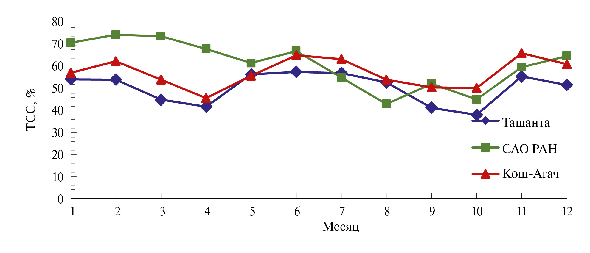 Общее покрытие облачностью не превышает 60% ни для одного месяца года для пункта Ташанта. Хорошо видно преимущество пункта Ташанта с сентября по апрель по сравнению с САО РАН, в том числе по сравнению с пунктом Кош-Агач с февраля по апрель, июнь-июль, с сентября по декабрь. И только августе процент облачности в САО РАН меньше. Отметим тенденцию к уменьшению облачности в районе САО РАН, связанную с изменением климата [12].