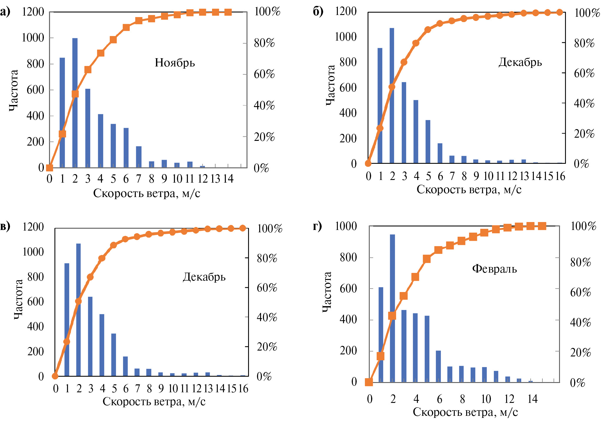 Рис. 4. Гистограммы распределения скорости ветра: а — ноябрь, б — декабрь, в — январь, г — февраль.