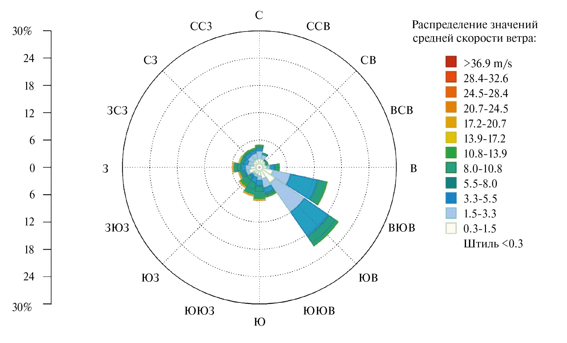 Что касается направления ветра, на рис. 5 показана роза ветров по данным метеостанции с 11 июня 2023 г. по 4 июня 2024 г. Преобладающее направление ветра демонстрирует некоторую изменчивость с выделением юго-восточного направления, при этом 9% времени имеет место штиль, а средняя скорость за время наблюдений составила 3.5 м/с.