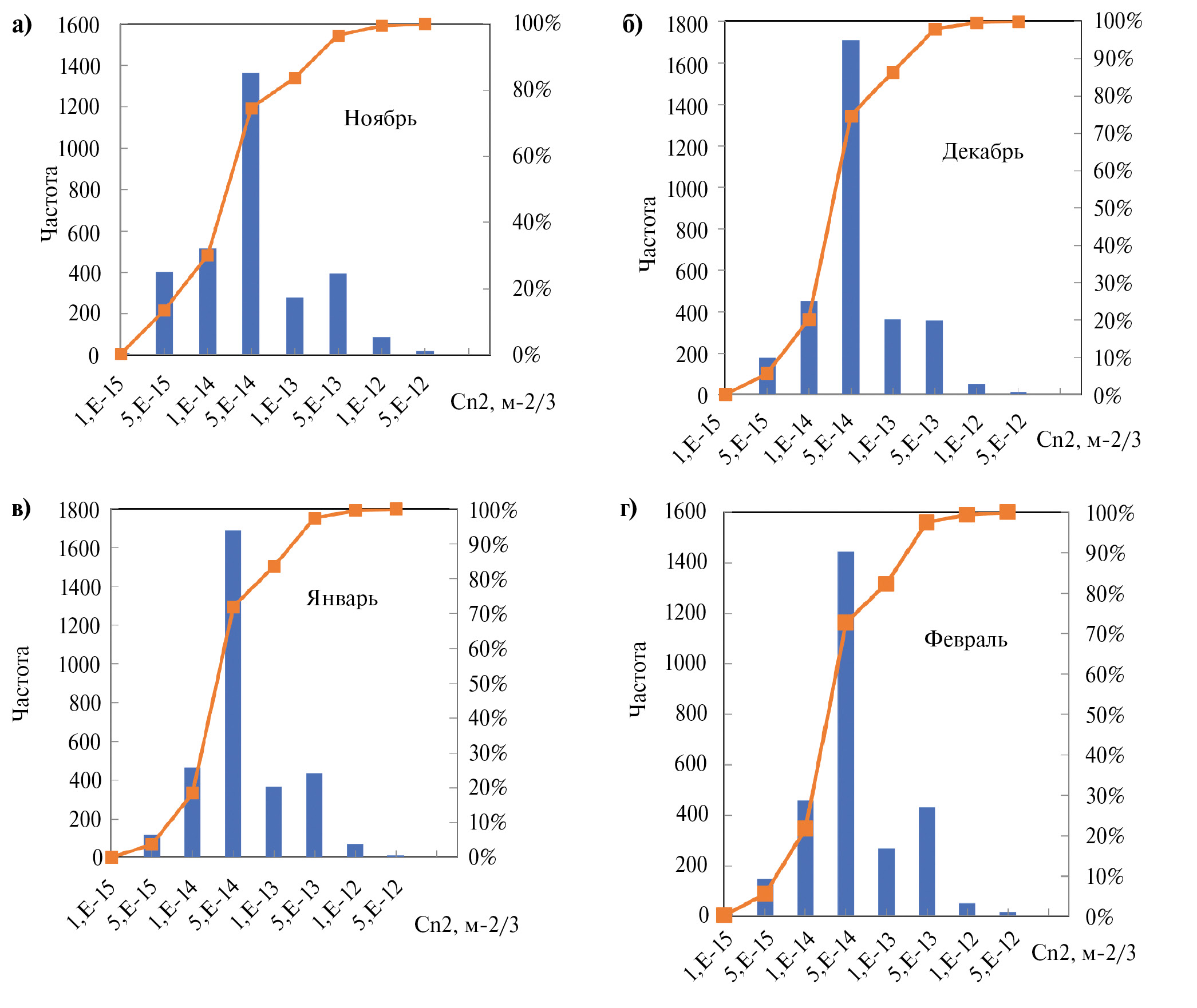 Рис. 6. Гистограммы распределения значений структурной постоянной показателя преломления: а — ноябрь, б — декабрь, в — январь, г — февраль.