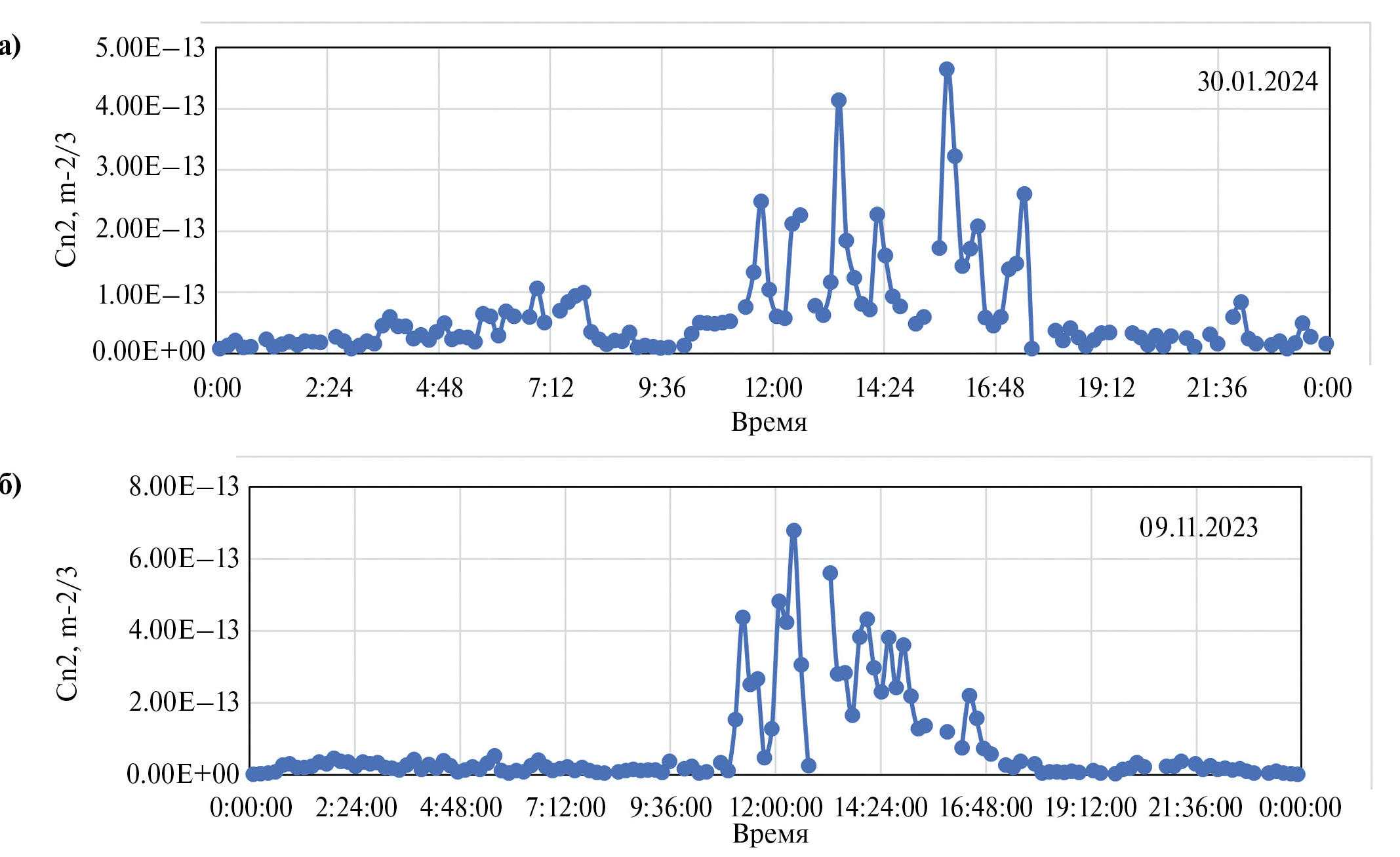 Хорошо видны более высокие дневные значения по сравнению с ночными. Отметим, что период повышенных значений днем сменяется низкими 7 · 10−14 м−2/3. Другими словами, не все дневные значения превышают ночные, равные 1.5 · 10−14 м−2/3. Это означает что даже днем возможны кратковременные периоды получения качественных изображений.
