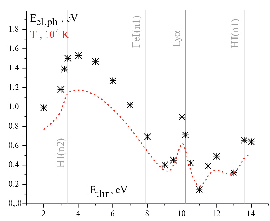 Рис. 1. Средняя энергия фотоэлектронов (точки, в эВ) и соответствующая температура (пунктирная линия, 1.5 kT = E el,ph ) в зависимости от порога фотоионизации, рассчитанная для спектра звезды Kelt9. Для сечения принята простая формула: σ ph ion = σ thr · ( E thr / E ) 3 , E > E thr . Вертикальные линии показывают пороги фотоионизации некоторых конкретных элементов или переходов.