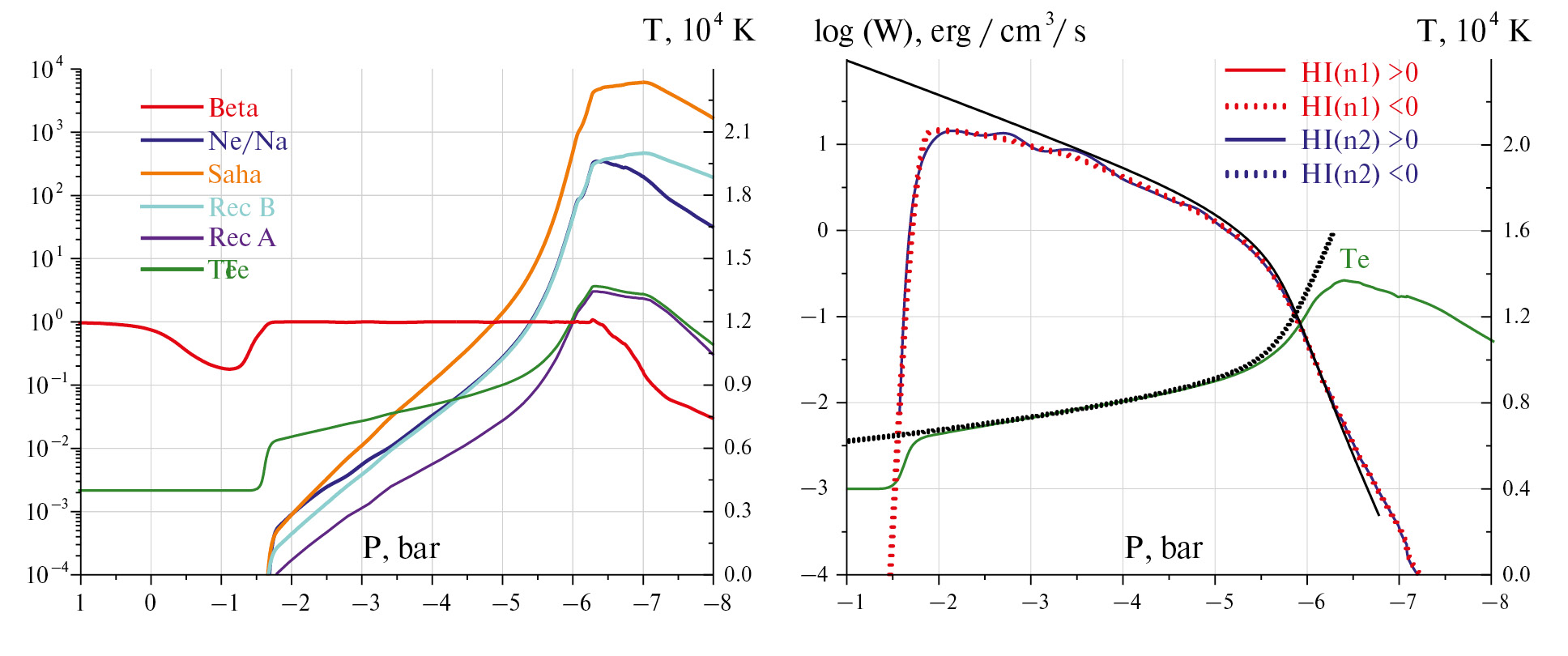 На рис. 3 представлены профили наиболее важных величин для H-He атмосферы, сначала без отрицательных ионов водорода. Профили взяты вдоль оси Y. Они показывают следующее. Прежде всего, заселенность возбужденного состояния водорода находится в ЛТР до тех пор, пока газ не становится частично прозрачным для фотонов рекомбинации типа А при давлениях ~10 –6 бар. Такой же результат (уменьшение населенности по сравнению с ЛТР при давлениях менее 10 –6 бар) был получен в работе [13] с применением CLOUDY. Проверено, что уменьшение β-фактора (отношения заселенности уровня к его ЛТР значению) перед ростом температуры от уровня нижней атмосферы (при давлениях <10 –2 бар), связано с двухфотонным распадом уровня HI(n = 2s). В диапазоне давлений 10 –2 –10 –6 бар отклонение от ЛТР составляет |1–β|<0.01. ЛТР равновесие обеспечивается практически полным захватом резонансных фотонов и равновесием двух основных процессов накачки и депопуляции возбужденного уровня — рекомбинации и фотоионизации. Степень ионизации, хотя и ниже равновесия Саха, очень велика и значительно превышает простой случай рекомбинации типа А, а также близко соответствует аналитической формуле, основанной на рекомбинации типа В. На правой панели показано, что аналитические оценки скорости нагрева благодаря фотоионизации уровня HI(n2) и температуры, при которой достигается баланс нагрева с охлаждением, которые несложно вывести из уравнений, приведенных в приложении, также находятся в хорошем согласии с моделированием. Отметим, что выключение XUV излучения или увеличение его в несколько раз с неизменным VUV потоком не меняет результат, т. е. вклад XUV излучения в нагрев ничтожно мал для Kelt9b, в том числе за счет большой оптический толщины атмосферы для фотонов с λ<91.2 нм. Фотоионизационный нагрев с возбужденного уровня балансируется охлаждением за счет электронной ионизации с основного состояния, что достигается при относительно высокой температуре. При давлениях <10 –6 бар β-фактор становится меньше единицы, и к охлаждению добавляется электронное возбуждение уровня n2 (известное как Lyα охлаждение в оптически тонкой плазме).