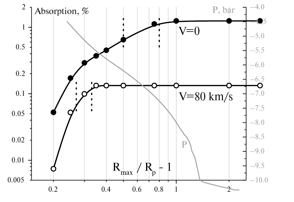 Рис. 8. Поглощение в процентах в центре линии Hα (V=0) и на далеком крыле (V=80 км/с), ограниченное атмосферой в пределах максимального радиуса вокруг планеты Rmax. Вертикальные штриховые линии показывают область формирования соответствующего поглощения от уровня 0.5 до 0.9 максимальной величины. Серая кривая показывает давление в атмосфере на соответствующих высотах (правая ось).
