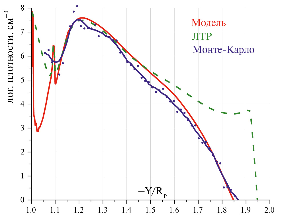 Более детальное моделирование показало, что такие легко ионизированные элементы, как Mg и Fe, могут вносить существенный вклад в общее нагревание, а также охлаждение [17]. Оказывается, что возбужденные уровни, поглощение которых в верхних атмосферах было обнаружено (Hα, HeI(2 3 S), OI(5S), FeI), могут сильно отклоняться от локального термодинамического равновесия (ЛТР). Отметим также, что частично ионизированная плазма горячих экзопланет также не достигает равновесия Саха. Причина — недостаточно высокие плотности электронов для столкновительного равновесия и плотности частиц для радиационного равновесия. Однако эффекты непрозрачности играют важную и даже доминирующую роль для некоторых переходов, например, для захвата фотонов Lyα в плотных слоях [16, 18].