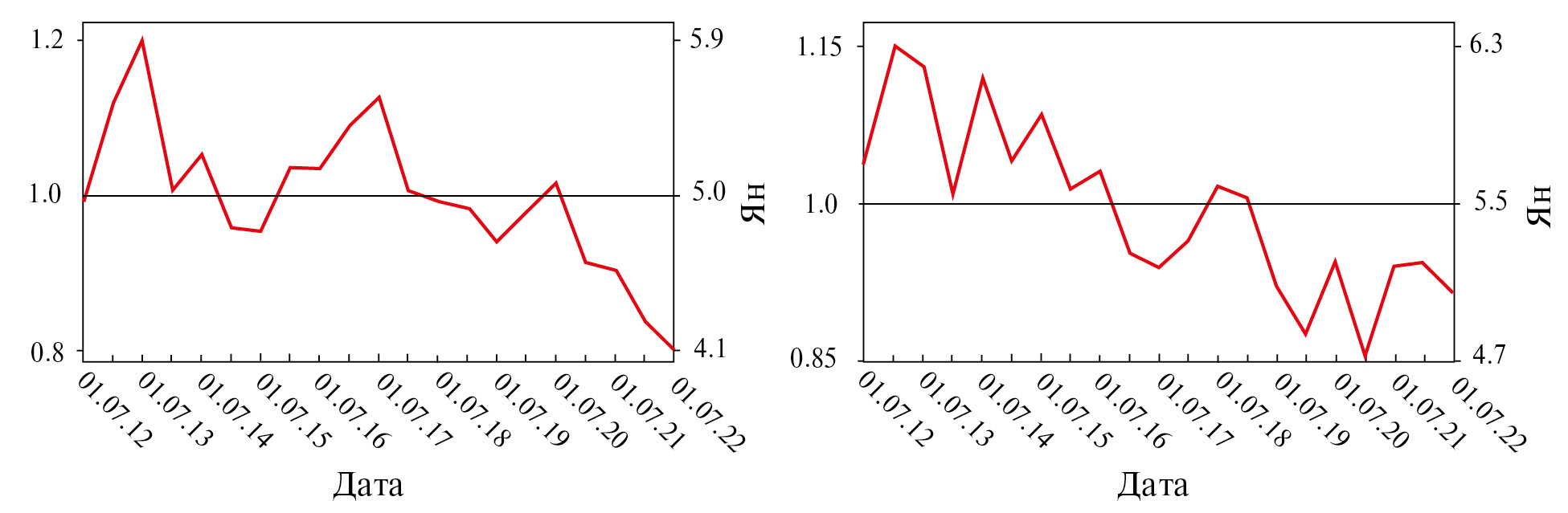 Рис. 1. Кривые блеска источников В0821+394 (слева) и В1812+412 (справа). Левая вертикальная ось на левой и правой панелях показывает интенсивность в долях от единицы (за единицу взято среднее значение интенсивности по всей кривой блеска), правая вертикальная ось показывает интегральную плотность потока источника в янских. На нижней горизонтальной оси размечено время в формате день, месяц, год. Шаг по времени между метками на горизонтальной оси составляет полгода.
