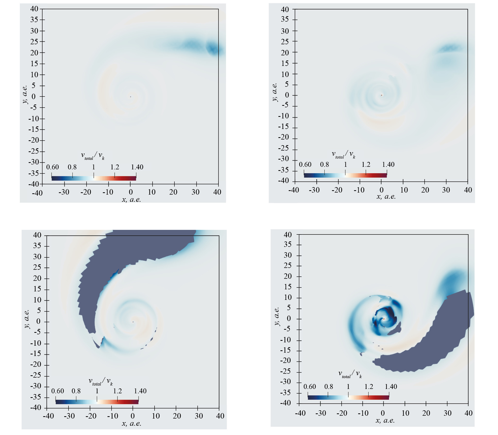 3. Fig. 2. The ratio of the total velocity to the local Keplerian velocity at a time of 50 years for four models (from left to right, top to bottom): OP-45, OP-r45, DP-45, DP-r45 on the surface of maximum density.