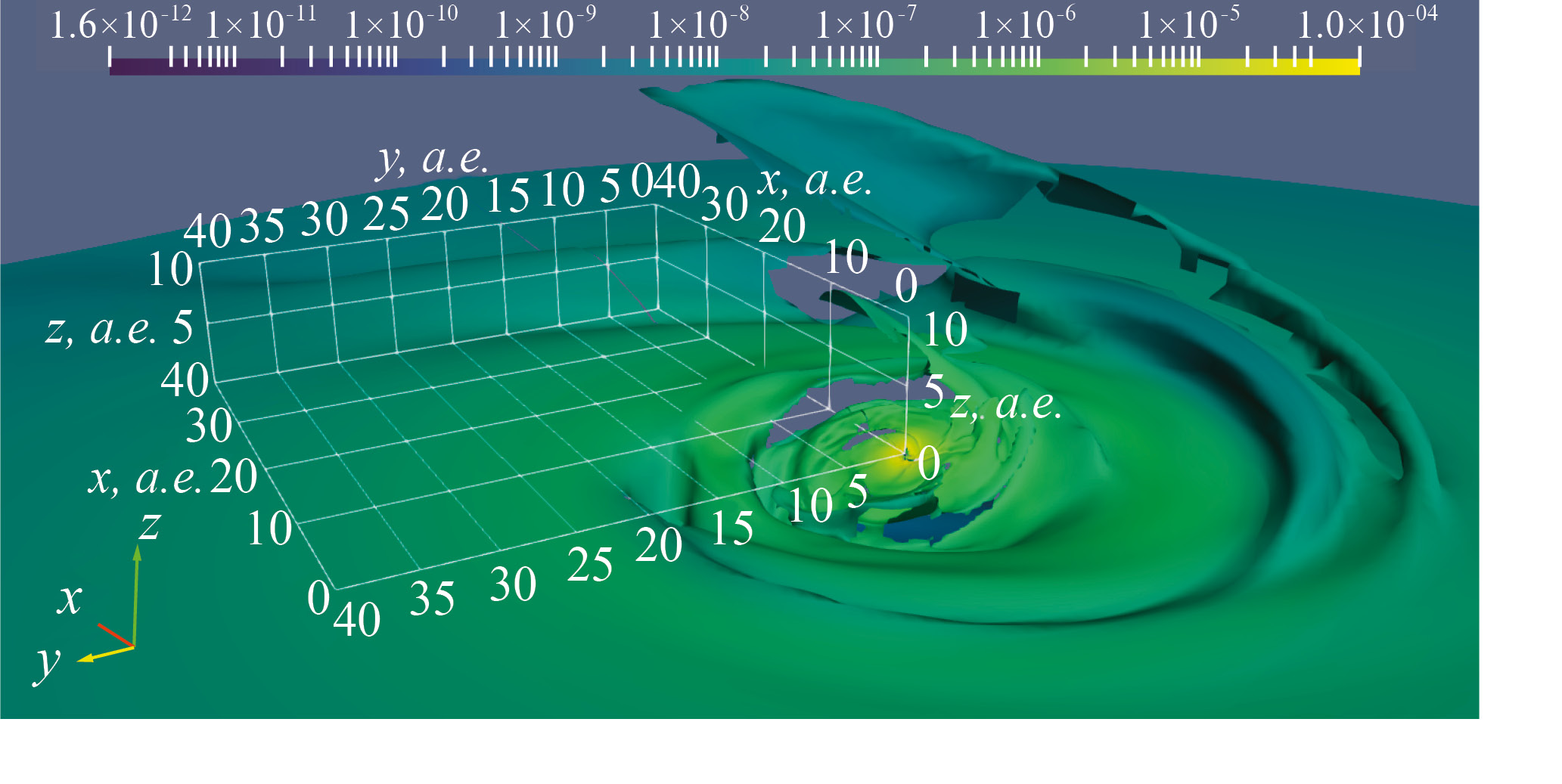 5. Fig. 4. Surface of maximum density at the time 90 years relative to the start of calculations in the DP-r45 model. The color shows the density in units. The coordinate parallelepiped is shown for scale.
