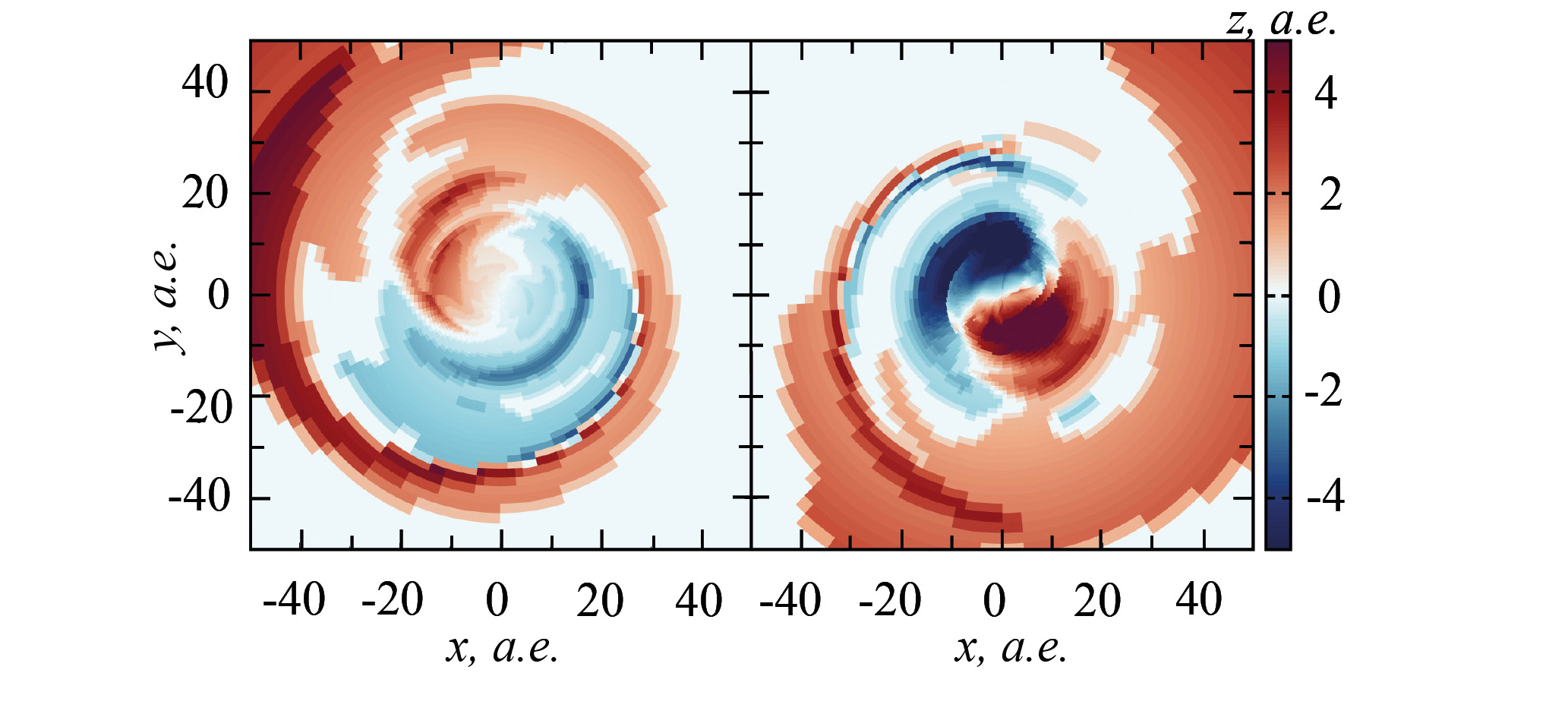 где α=0.001 MathType@MTEF@5@5@+= feaahGart1ev3aqatCvAUfeBSjuyZL2yd9gzLbvyNv2Caerbov2D09 MBdbqedmvETj2BSbqeeuuDJXwAKbsr4rNCHbGeaGqik8fkY=xipgYl h9vqqj=hEeeu0xXdi9arFj0xirFj0dXdbba91qpK0=yr0RYxfr=Jbb f9q8aq0=yq=He9q8qqQ8frFve9Fve9Ff0dmeaabaqaciaacaGaaeqa baqabeGadaaakeaaqaaaaaaaaaWdbiabeg7aHjabg2da9iaaicdaca GGUaGaaGimaiaaicdacaaIXaaaaa@376B@ , cS MathType@MTEF@5@5@+= feaahGart1ev3aqatCvAUfeBSjuyZL2yd9gzLbvyNv2CaerbuLwBLn hiov2DGi1BTfMBaeXatLxBI9gBaerbd9wDYLwzYbItLDharqqtubsr 4rNCHbGeaGqiVu0Je9sqqrpepC0xbbL8F4rqqrFfpeea0xe9Lq=Jc9 vqaqpepm0xbba9pwe9Q8fs0=yqaqpepae9pg0FirpepeKkFr0xfr=x fr=xb9adbaqaaeGaciGaaiaabeqaamaabaabaaGcbaqef4uz3r3BUb acfaqcLbvaqaaaaaaaaaWdbiaa=nbiaaa@3A29@  локальная скорость звука, а H MathType@MTEF@5@5@+= feaahGart1ev3aqatCvAUfeBSjuyZL2yd9gzLbvyNv2CaerbuLwBLn hiov2DGi1BTfMBaeXatLxBI9gBaerbd9wDYLwzYbItLDharqqtubsr 4rNCHbGeaGqiVu0Je9sqqrpepC0xbbL8F4rqqrFfpeea0xe9Lq=Jc9 vqaqpepm0xbba9pwe9Q8fs0=yqaqpepae9pg0FirpepeKkFr0xfr=x fr=xb9adbaqaaeGaciGaaiaabeqaamaabaabaaGcbaqef4uz3r3BUb acfaqcLbvaqaaaaaaaaaWdbiaa=nbiaaa@3A29@  характерный вертикальный масштаб диска (в начальный момент времени определяется формулой (13), см. ниже). В расчетах было принято, что H=csΩ, где Ω MathType@MTEF@5@5@+= feaahGart1ev3aqatCvAUfeBSjuyZL2yd9gzLbvyNv2CaerbuLwBLn hiov2DGi1BTfMBaeXatLxBI9gBaerbd9wDYLwzYbItLDharqqtubsr 4rNCHbGeaGqiVu0Je9sqqrpepC0xbbL8F4rqqrFfpeea0xe9Lq=Jc9 vqaqpepm0xbba9pwe9Q8fs0=yqaqpepae9pg0FirpepeKkFr0xfr=x fr=xb9adbaqaaeGaciGaaiaabeqaamaabaabaaGcbaqef4uz3r3BUb acfaqcLbvaqaaaaaaaaaWdbiaa=nbiaaa@3A29@  локальная кеплеровская угловая скорость. Данное соотношение применимо в случае вертикального гидростатического равновесия, которое сохраняется до касания вещества струи с поверхностью диска. В дальнейшем, когда начальная плоскость диска искажается, может быть выделена поверхность максимальной плотности, относительно которой можно оценить средний характерный вертикальный масштаб диска (по аналогии с распределением (12), см. ниже: ρ r,ϕ,z z 0 =H ρ max r,ϕ, z 0 = e 1/2 MathType@MTEF@5@5@+= feaahGart1ev3aqatCvAUfeBSjuyZL2yd9gzLbvyNv2Caerbov2D09 MBdbqedmvETj2BSbqeeuuDJXwAKbsr4rNCHbGeaGqik8fkY=xipgYl h9vqqj=hEeeu0xXdi9arFj0xirFj0dXdbba91qpK0=yr0RYxfr=Jbb f9q8aq0=yq=He9q8qqQ8frFve9Fve9Ff0dmeaabaqaciaacaGaaeqa baqabeGadaaakeaaqaaaaaaaaaWdbmaalaaapaqaa8qacqaHbpGCda qadaWdaeaapeGaamOCaiaacYcacqaHvpGzcaGGSaGaamOEaiabgkHi TiaadQhapaWaaSbaaSqaa8qacaaIWaaapaqabaGcpeGaeyypa0Jaam isaaGaayjkaiaawMcaaaWdaeaapeGaeqyWdi3damaaBaaaleaapeGa aeyBaiaabggacaqG4baapaqabaGcpeWaaeWaa8aabaWdbiaadkhaca GGSaGaeqy1dyMaaiilaiaadQhapaWaaSbaaSqaa8qacaaIWaaapaqa baaak8qacaGLOaGaayzkaaaaaiabg2da9iaadwgapaWaaWbaaSqabe aapeGaaGymaiaac+cacaaIYaaaaaaa@5049@  при фиксированных r MathType@MTEF@5@5@+= feaahGart1ev3aqatCvAUfeBSjuyZL2yd9gzLbvyNv2Caerbov2D09 MBdbqedmvETj2BSbqeeuuDJXwAKbsr4rNCHbGeaGqik8fkY=xipgYl h9vqqj=hEeeu0xXdi9arFj0xirFj0dXdbba91qpK0=yr0RYxfr=Jbb f9q8aq0=yq=He9q8qqQ8frFve9Fve9Ff0dmeaabaqaciaacaGaaeqa baqabeGadaaakeaaqaaaaaaaaaWdbiaadkhaaaa@3222@  и ϕ MathType@MTEF@5@5@+= feaahGart1ev3aqatCvAUfeBSjuyZL2yd9gzLbvyNv2Caerbov2D09 MBdbqedmvETj2BSbqeeuuDJXwAKbsr4rNCHbGeaGqik8fkY=xipgYl h9vqqj=hEeeu0xXdi9arFj0xirFj0dXdbba91qpK0=yr0RYxfr=Jbb f9q8aq0=yq=He9q8qqQ8frFve9Fve9Ff0dmeaabaqaciaacaGaaeqa baqabeGadaaakeaaqaaaaaaaaaWdbiabew9aMbaa@32F3@  ). Расчеты показали соответствие по порядку величины полученного таким образом характерного вертикального масштаба диска и отношения скорости звука к локальной кеплеровской скорости в течение всего времени моделирования. Отклонение csΩ от значения H MathType@MTEF@5@5@+= feaahGart1ev3aqatCvAUfeBSjuyZL2yd9gzLbvyNv2Caerbov2D09 MBdbqedmvETj2BSbqeeuuDJXwAKbsr4rNCHbGeaGqik8fkY=xipgYl h9vqqj=hEeeu0xXdi9arFj0xirFj0dXdbba91qpK0=yr0RYxfr=Jbb f9q8aq0=yq=He9q8qqQ8frFve9Fve9Ff0dmeaabaqaciaacaGaaeqa baqabeGadaaakeaaqaaaaaaaaaWdbiaadIeaaaa@31F8@  может быть скорректировано вариациями параметра α MathType@MTEF@5@5@+= feaahGart1ev3aqatCvAUfeBSjuyZL2yd9gzLbvyNv2Caerbov2D09 MBdbqedmvETj2BSbqeeuuDJXwAKbsr4rNCHbGeaGqik8fkY=xipgYl h9vqqj=hEeeu0xXdi9arFj0xirFj0dXdbba91qpK0=yr0RYxfr=Jbb f9q8aq0=yq=He9q8qqQ8frFve9Fve9Ff0dmeaabaqaciaacaGaaeqa baqabeGadaaakeaaqaaaaaaaaaWdbiabeg7aHbaa@32CA@  в пределах 10 4 10 2 MathType@MTEF@5@5@+= feaahGart1ev3aqatCvAUfeBSjuyZL2yd9gzLbvyNv2Caerbov2D09 MBdbqedmvETj2BSbqeeuuDJXwAKbsr4rNCHbGeaGqik8fkY=xipgYl h9vqqj=hEeeu0xXdi9arFj0xirFj0dXdbba91qpK0=yr0RYxfr=Jbb f9q8aq0=yq=He9q8qqQ8frFve9Fve9Ff0dmeaabaqaciaacaGaaeqa baqabeGadaaakeaaqaaaaaaaaaWdbiaaigdacaaIWaWdamaaCaaale qabaWdbiabgkHiTiaaisdaaaGccqGHsislcaaIXaGaaGima8aadaah aaWcbeqaa8qacqGHsislcaaIYaaaaaaa@38F8@ . Вариации α могут быть обоснованы физическими процессами, протекающими в диске и влияющими на перенос углового момента (см., напр., [52]), но не учитываемыми при данном моделировании.