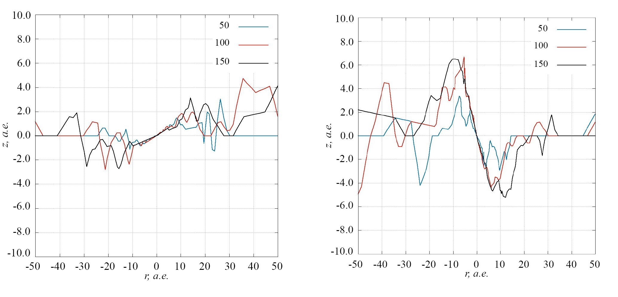 7. Fig. 6. Values ​​of the coordinate at which the density of the disk matter is maximum depending on the distance ( ) at fixed  (  ) and  (  ) at the moments of time 50 years (blue line), 100 years (red line) and 150 years (black line) from the beginning of the calculations. The case of co-directional fall is shown on the left, and retrograde fall on the right.