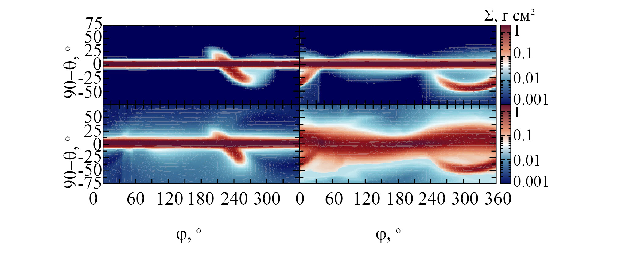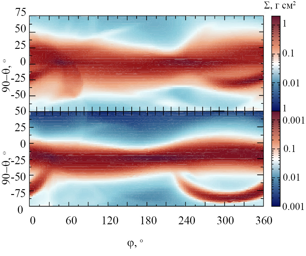 9. Fig. 8. The color shows the ray concentration of dust matter depending on the direction of the line of sight in azimuth () and inclination () at a time of 10 years. On the left are shown models in which the orbit of the falling matter intersects the plane of the disk once (OP-45 from above and OP-p45 from below), on the right is a double intersection (DP-45 from above and DP-p45 from below) of the disk.