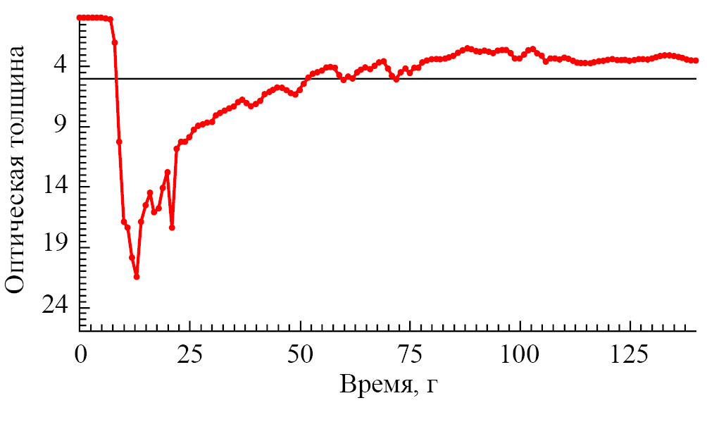 Маломассивная звезда AA Tau являлась переменной звездой с колебаниями блеска с периодом 8.5 дней, который близок к периоду вращения звезды [8]. Авторы связывают переменность звезды с ее периодическим экранированием наклонным внутренним диском, существование которого обусловлено наклоном оси магнитного диполя к оси вращения звезды. Однако в 2011 г. произошло падение блеска звезды на ∼2m в полосе V, которое сопровождалось покраснением в ближней ИК области. До сих пор звезда не вернулась в яркое состояние [9]. В работе [10] был выполнен анализ изображения AA Tau, полученного в обзоре ALMA (Atacama Large Millimeter Array). Он показал, что протопланетный диск этой звезды имеет многополосную структуру в миллиметровой пыли. Кроме того, внутренний диск (размером ∼10 а. е.) наклонен относительно периферии диска на ∼20°. А также авторы предполагают, что на поверхности диска имеется горб или поток вещества, соединяющий внутренний и внешний диски. Увеличение толщины внутреннего диска или прохождение потока вещества на луче зрения может быть причиной существенного падения блеска звезды.