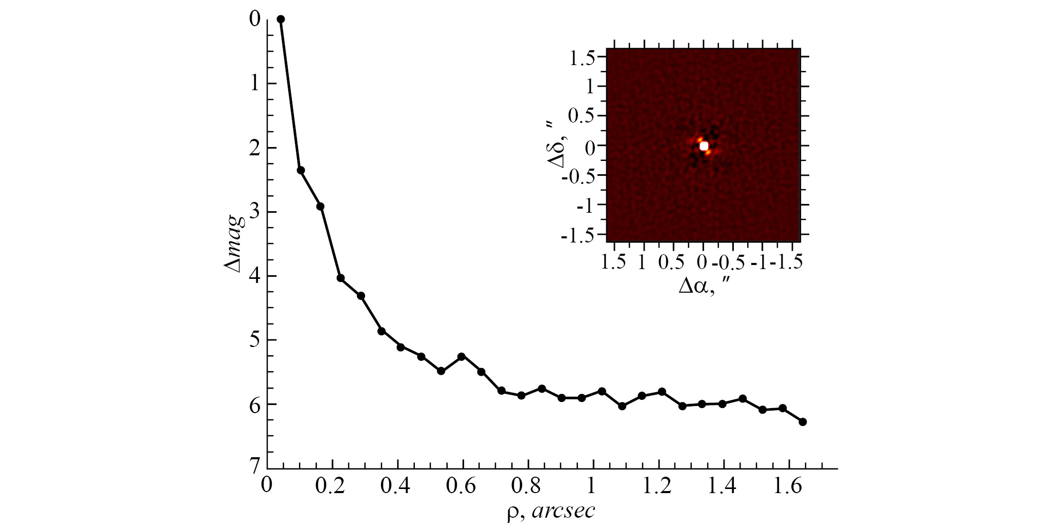 Во все три эпохи спекл-интерферометрических наблюдений двойственность объекта не была обнаружена. Методом, приведенным в работе [9], произведена оценка предела по контрасту, результат для эпохи 20221222 представлен на рис. 1. На том же рисунке в правом верхнем углу дана автокорреляционная функция, вычисленная из среднего спектра мощности. Структура на расстоянии ′′ от звезды на позиционных углах и вызвана дрожанием монтировки телескопа. Аналогичные структуры наблюдались у других объектов, снимавшихся в ту ночь.
