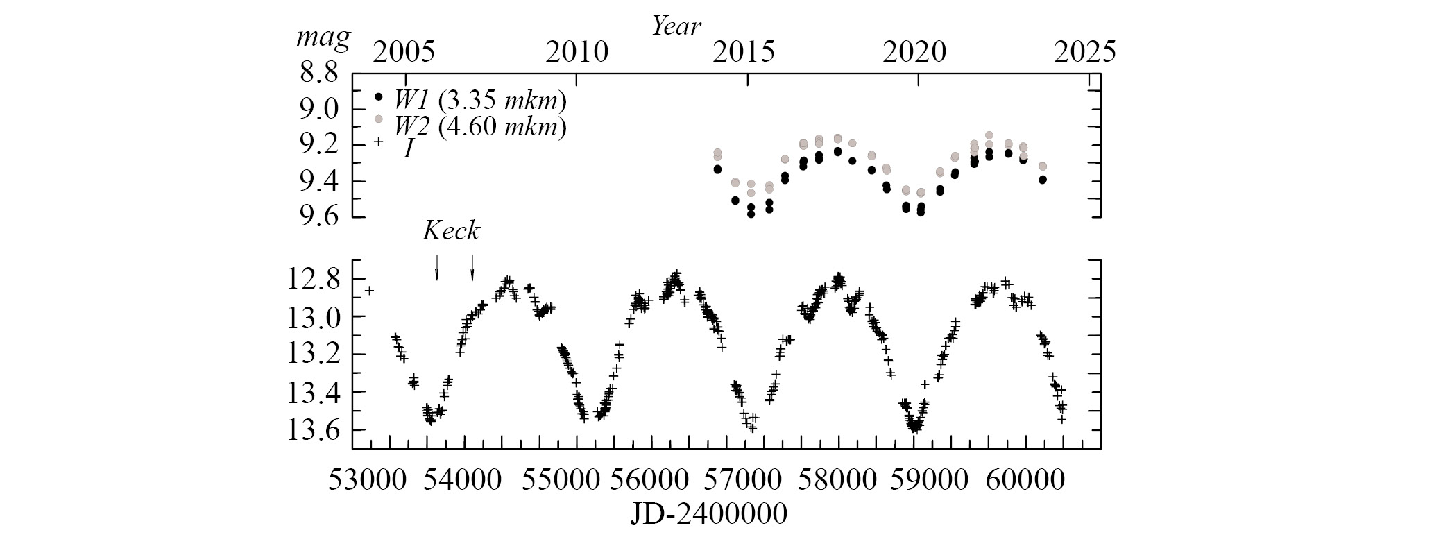Кроме оптической кривой блеска на рис. 2 показаны результаты наблюдений V718 Per в полосах W1 и W2 (3.4 и 4.6 мкм соответственно) по данным каталога NEOWISE [2]. Видно, что колебания с периодом 4.7 года отчетливо наблюдаются также и в ближней ИК области спектра. Ранее аналогичный вывод был сделан на основе наших наблюдений V718 Per в полосах JHK [4].