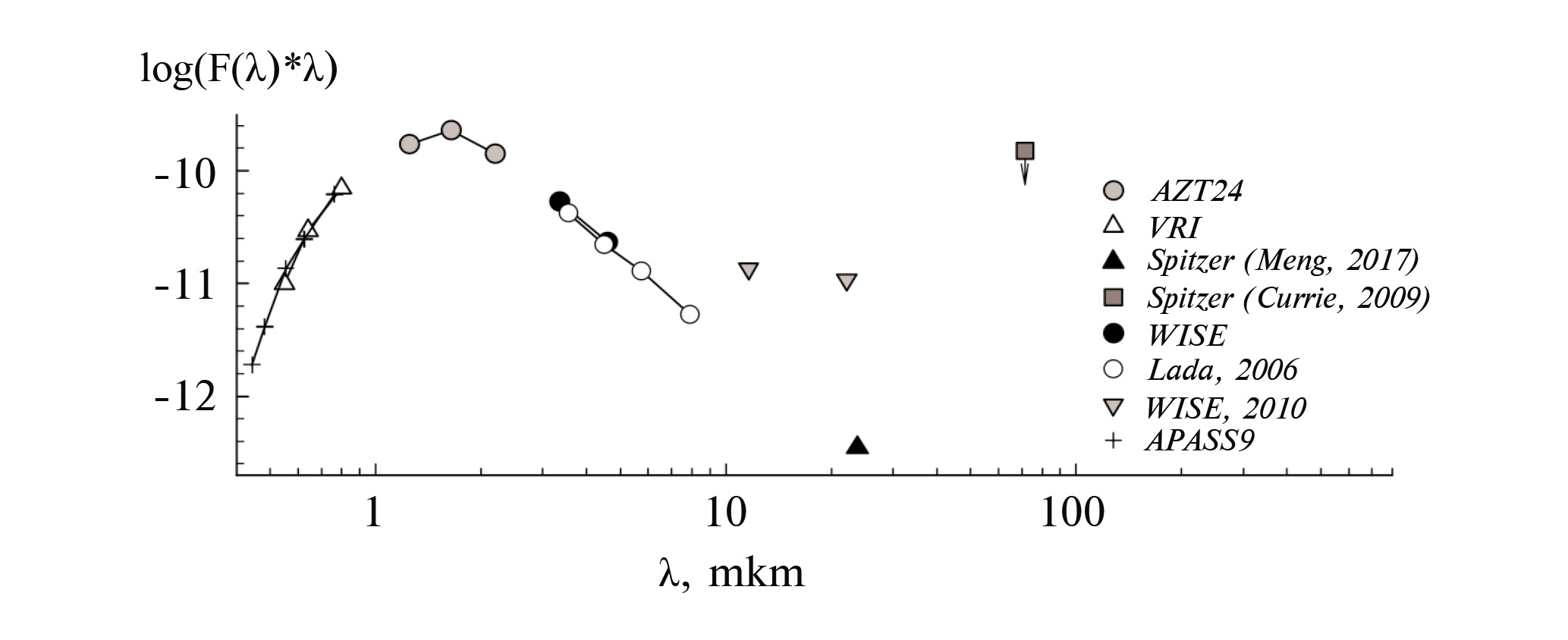 На рис. 4 показано распределение энергии в спектре V718 Per, построенное по данным наблюдений в ярком состоянии звезды (см. табл. 2). Они включают наши собственные наблюдения в полосах VRI (приняты средние значения блеска звезды в этих полосах вне затмений), наблюдения в ярком состоянии в полосах , , , r ′, i ′ из архива APASS9 [13], а также данные наших ИК наблюдений в полосах JHK в ярком состоянии из статьи [4]. Инфракрасные наблюдения дополнены данными из архивов WISE [17] и Spitzer [14, 15, 16]. Эти наблюдения (за исключением двух полос и ) также получены в ярком состоянии звезды. Из рис. 4 видно, что наблюдения в полосах и (12 и 22 мкм) демонстрируют значительный ИК избыток излучения. С другой стороны, данные Spitzer на длине волны 24 мкм, полученные после переобработки наблюдений [16], не показывают значимого ИК избытка. Это может означать, что либо данные и неточны, либо в ближайшем околозвездном окружении звезды появилось (уже после наблюдений на Spitzer) большое количество пыли на расстояниях порядка нескольких а. е. от звезды, вызвавшее усиление ИК излучения объекта. Необходимо, однако, иметь в виду, что угловое разрешение WISE в полосе равно 12′′ [17]. Поскольку на расстоянии около 10′′ от V718 Per находится близкая по яркости звезда скопления H 178, результаты наблюдений V718 Per в полосе могут быть завышены по этой причине.