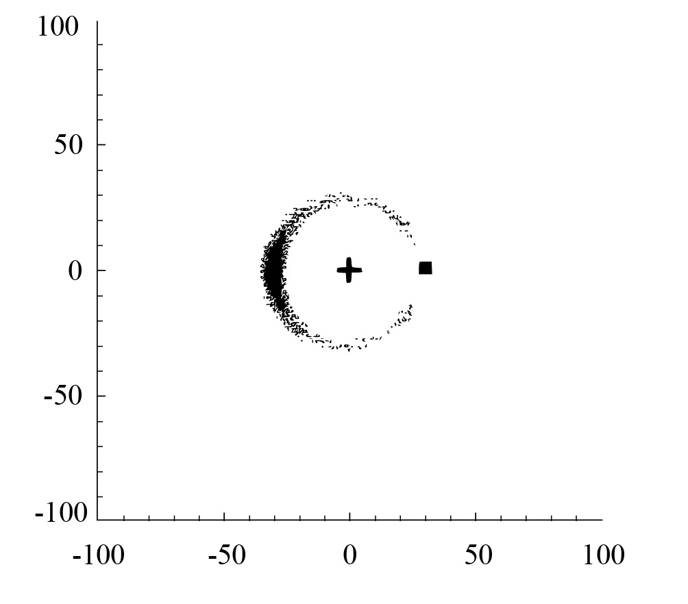 Рис. 5. Пример модельного распределения частиц, движущихся в резонансе 1:1 с планетой по данным [18].