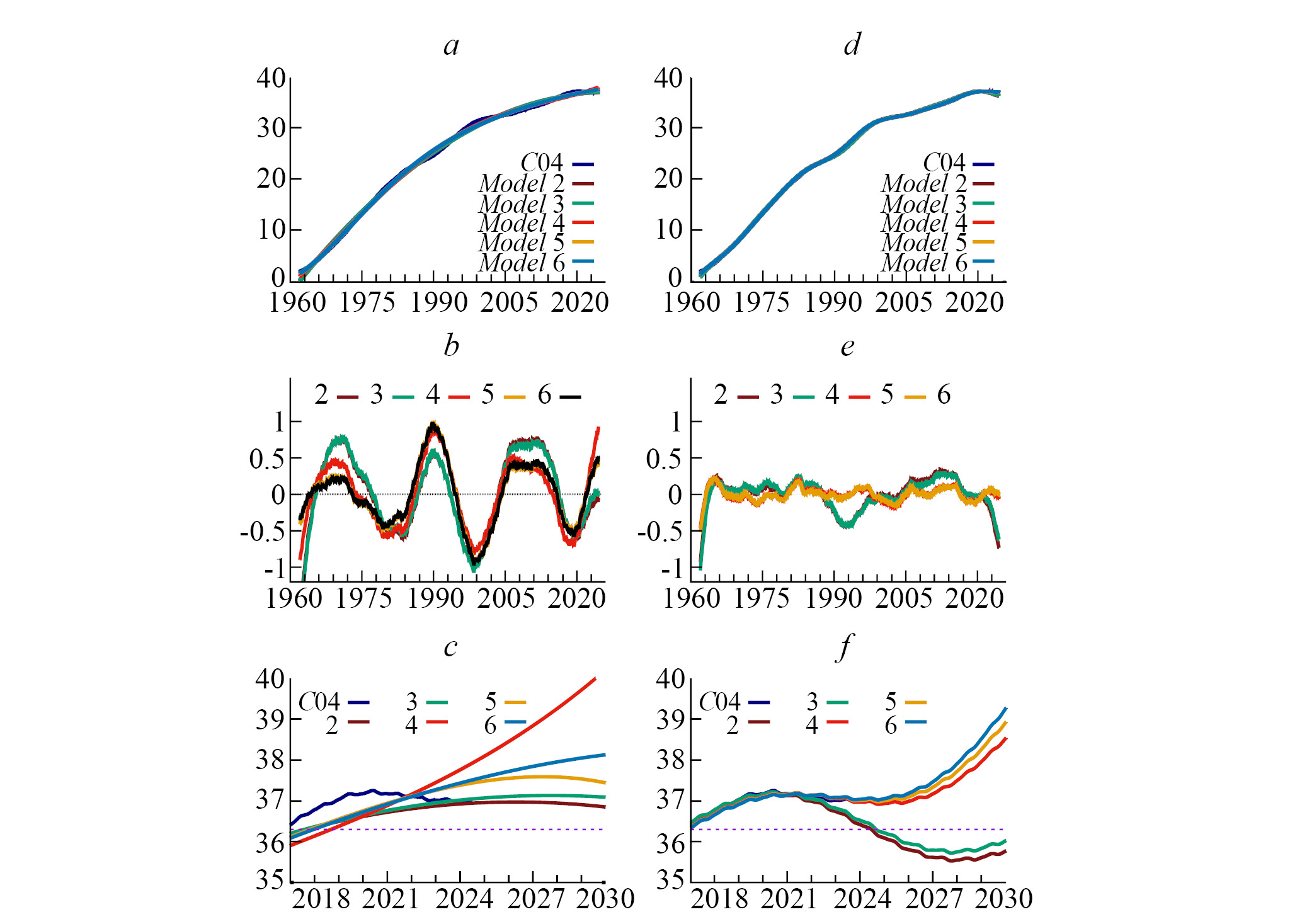 Ряд C04 TAI–UT1 был аппроксимирован полиномиальной моделью для определения глобально тренда всемирного времени на интервале последних 50+ лет поддержания шкалы UTC. Вычисления были проведены с полиномами от второй до шестой степени. Результаты этого моделирования показаны в левой части рис. 2, где представлены сравнение модели с рядом C04 (верхняя панель), отклонения «модель минус C04» (средняя панель) и результаты экстраполяции модели до 2030 г. (внизу).