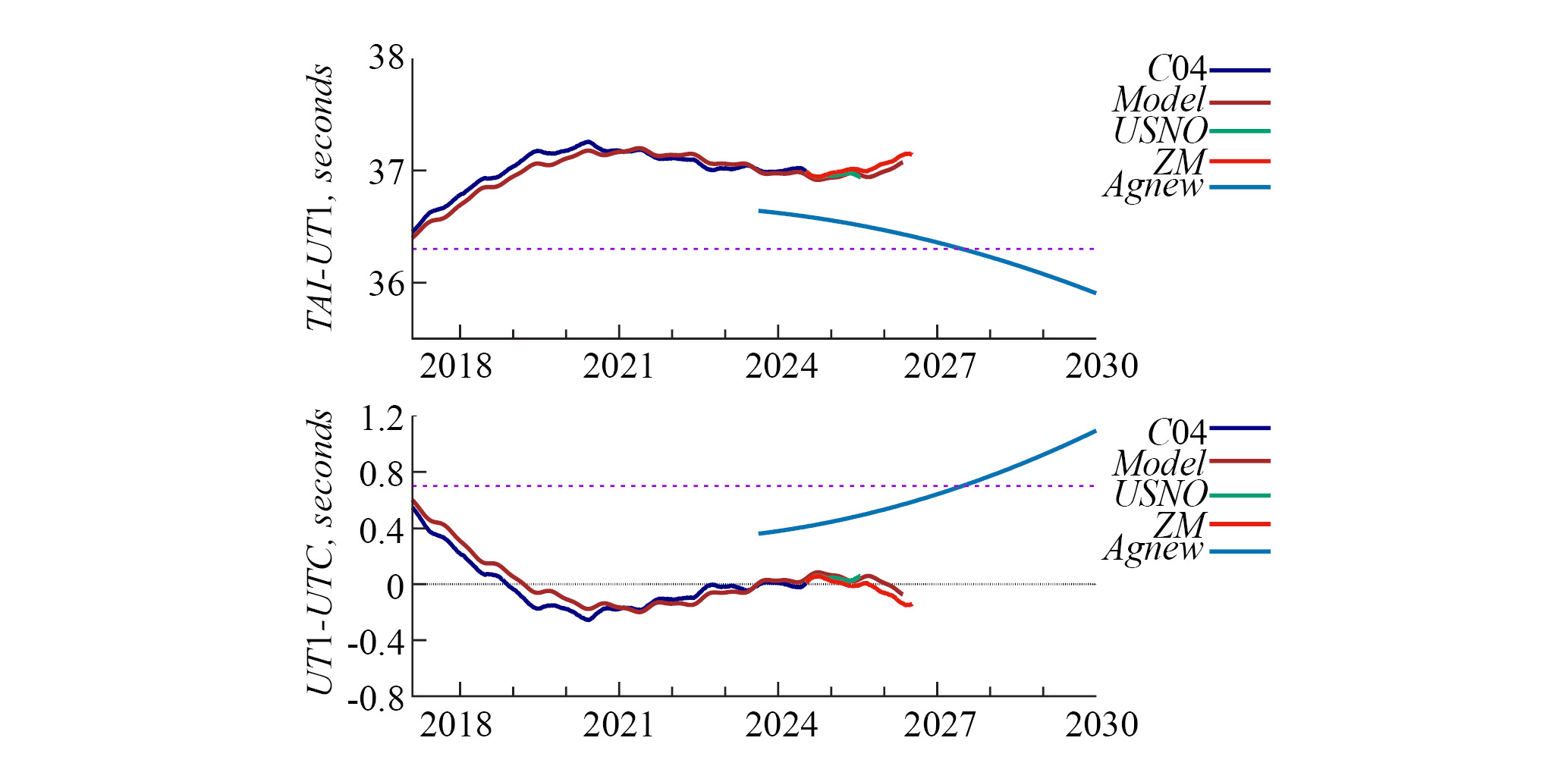 Хотя результаты прогнозов всемирного времени, представленные на рис. 3, несколько различаются, все они предсказывают, что ускорение вращения Земли должно прекратиться в течение ближайшего времени и не предполагают возобновления ускорения вращения Земли до 2030-х годов. Это противоречит выводу, сделанному в работе [7], который предполагает, наоборот, рост ускорения вращения Земли после 2023–2024 г.