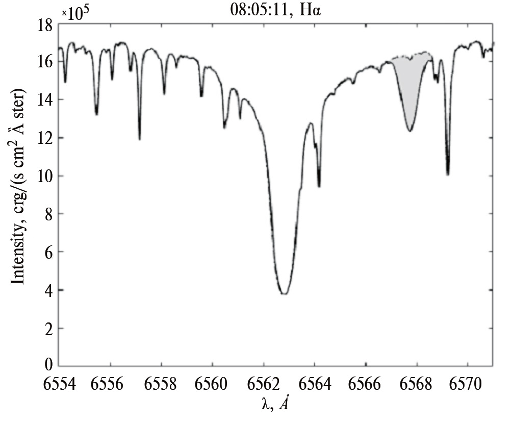 Рис. 4. Пример определения потока излучения в линии Hα. Заштрихованная часть соответствует потоку от «светящегося» фрагмента выброса.