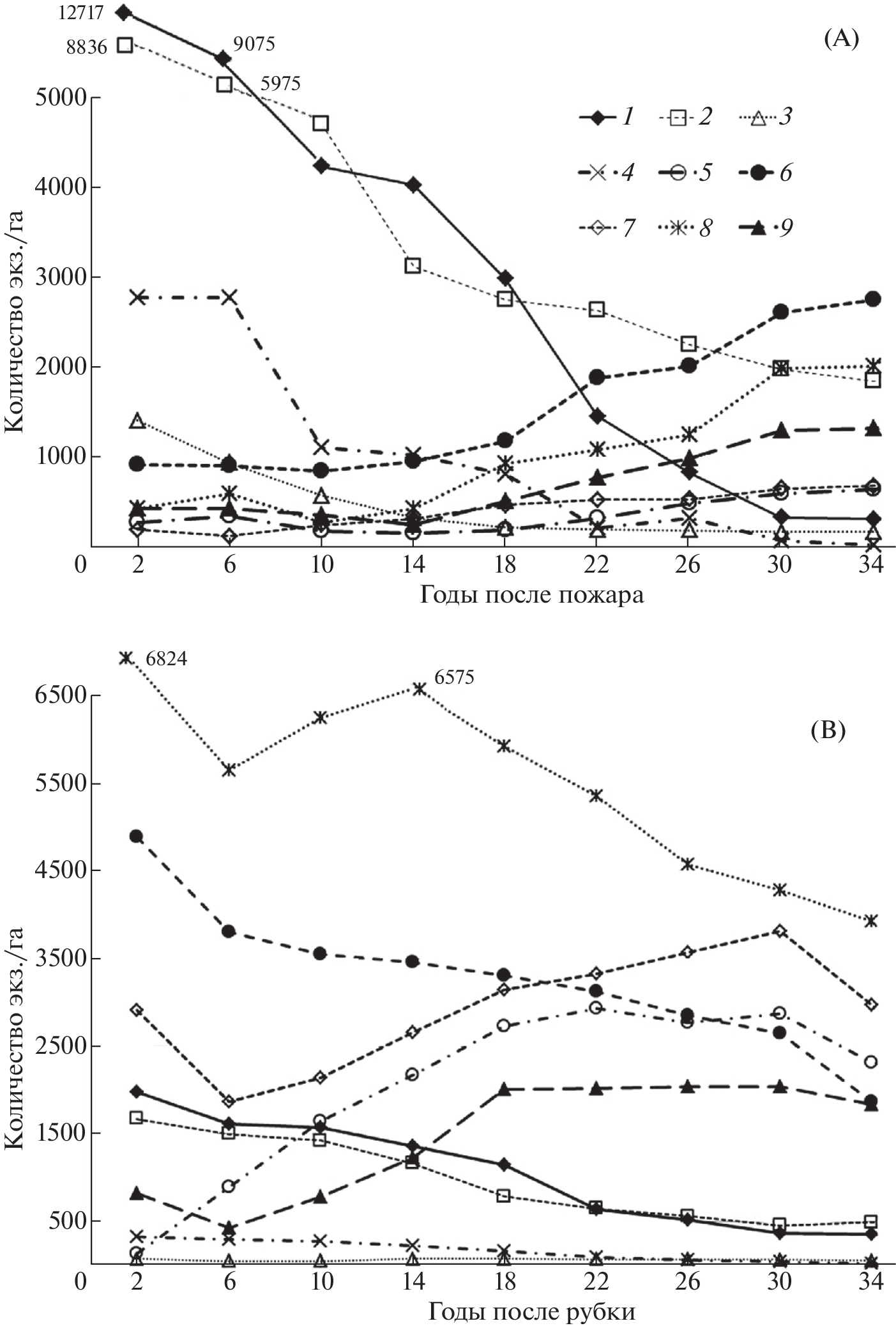 A comparative analysis of the formation and natural course of development of plant communities was carried out in two plots: (1) passed through by a stable ground fire and (2) subjected to experimental clear cutting with preserving young generation of tree species in liana-varied-shrub broad-leaved-dark-coniferous-Korean-pine forests of the mid-mountain belt of the Southern Sikhote-Alin. The features of natural recovery, course of growth, development and dynamics of the number of woody plants in the first 35 years of the reforestation process are considered. Taxation characteristic of the forest stands before their destruction by the fire and cutting, as well as at the first stages of the formation of young tree stands, are given. The dynamics of the species composition and phytomass of the aboveground parts of plants of the shrub and low-shrub-herb layers is considered.