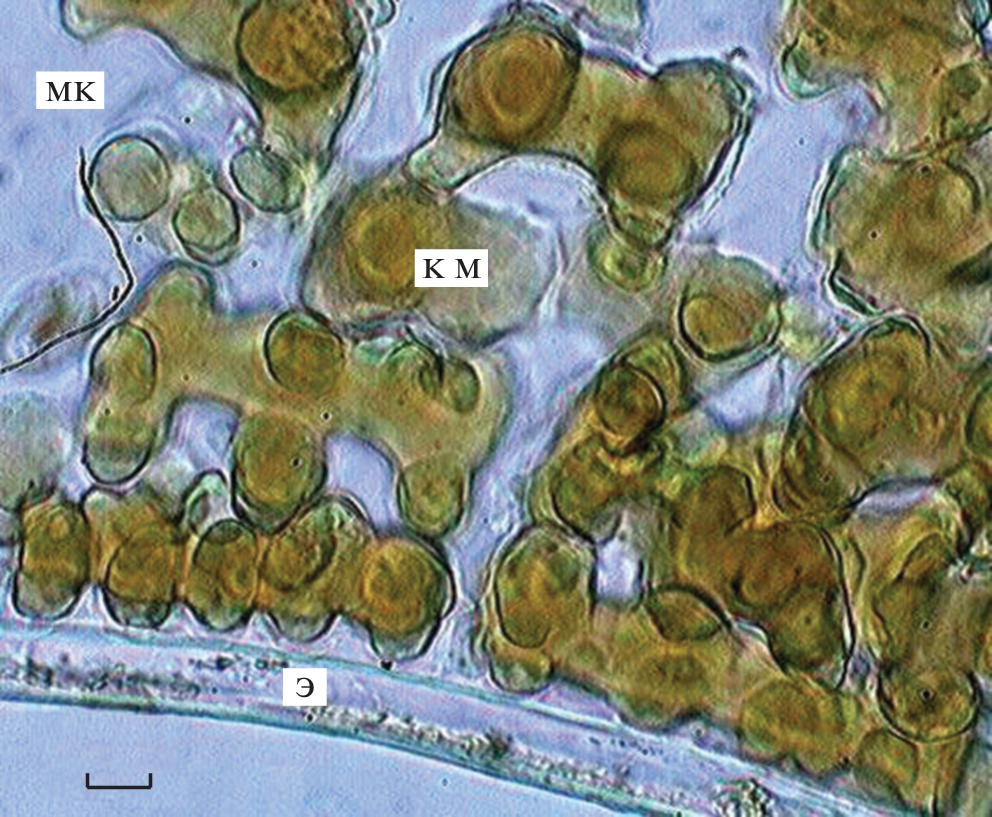 Рассмотрены строение мезофилла хвои и форма ассимиляционных клеток у видов рода Larix на примере L. gmelini var. gmelini, L. decidua, L. kaempferi и L. sibirica. Образцы хвои фиксировались в смеси Гаммалунда. Изучение мезофилла проводилось на поперечных, парадермальных и радиальных срезах средней части хвои с помощью светового микроскопа. Для уточнения формы клеток хлоренхимы использовали мацерированные препараты. Показано, что мезофилл хвои у видов рода Larix состоит преимущественно из крупных клеток сложной формы, которые, соприкасаясь своими выпуклыми частями или концами, образуют хорошо развитую систему межклетников, что может способствовать интенсивному газообмену. Описаны различные варианты плоских складчатых, плоских ячеистых и более усложненных, складчато-ячеистых ассимиляционных клеток. Плоские складчатые клетки характеризуются разнообразными лопастными конфигурациями на поперечных срезах и вытянутыми овальными проекциями на радиальных сечениях. Плоские ячеистые клетки обнаруживаются на продольных срезах хвои и состоят из клеточных звеньев, обращенных как перпендикулярно (ячеистые клетки первой группы), так и параллельно (ячеистые клетки второй группы) к листовой поверхности. В складчато-ячеистых клетках сочетаются складчатые контуры в поперечнике и ячеистые очертания в продольном направлении. В мезофилле хвои изученных видов рода Larix проявляется слабая дифференциация на палисадную и губчатую паренхимы, между которыми дополнительно выделяются клетки средней части (срединные клетки). Срединные клетки расположены по обе стороны от проводящего пучка по большому радиусу хвои, они могут быть как плоскими слабо складчатыми, так и складчато-ячеистыми. Рассмотренные виды Larix близки по размерам ассимиляционных клеток и структуре мезофилла хвои, основные различия между ними связаны с особенностями рассеченности клеток как в поперечном, так и продольном направлениях.