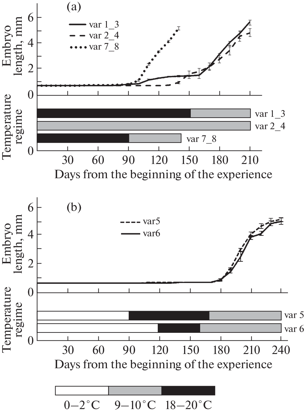 В статье изложены результаты опыта по длительному влиянию холода (0–2°С) на процесс прорастания семян Cardiocrinum cordatum var. glehnii (Liliaceae) со сложным морфофизиологическим типом покоя. Подтверждено, что теплая стратификация (9–20°С) для осуществления доразвития зародыша и холодная стратификация (0–2°С) для роста зародышевого корня являются ключевыми факторами, влияющими на прорастание семян этого вида. Установлено, что холодная стратификация в начале опыта не запускает и не ускоряет рост зародыша при его доразвитии, а температурный режим теплой стратификации при доразвитии зародыша не оказывает влияние на последующий рост зародышевого корня и прорастание семян. Выявлена прямая зависимость протяженности воздействия холодом на энергию и скорость прорастания семян, а также на длительность этого процесса. При более продолжительном воздействии низкими температурами существенно увеличивались темпы прорастания. Сухое хранение семян в течение 6 месяцев при температуре 0–2°С также способствовало более быстрому прорастанию семян. Различия по продолжительности и периоду (до или после доразвития зародыша) воздействия холода не влияли на окончательный процент проросших семян, он был высоким во всех вариантах опыта (86–100%). Это указывает на то, что процесс прорастания семян C. cordatum var. glehnii в лабораторных условиях может осуществляться при разных температурных режимах, что, вероятно, обеспечивает пластичность возобновления данного вида и в природных условиях.